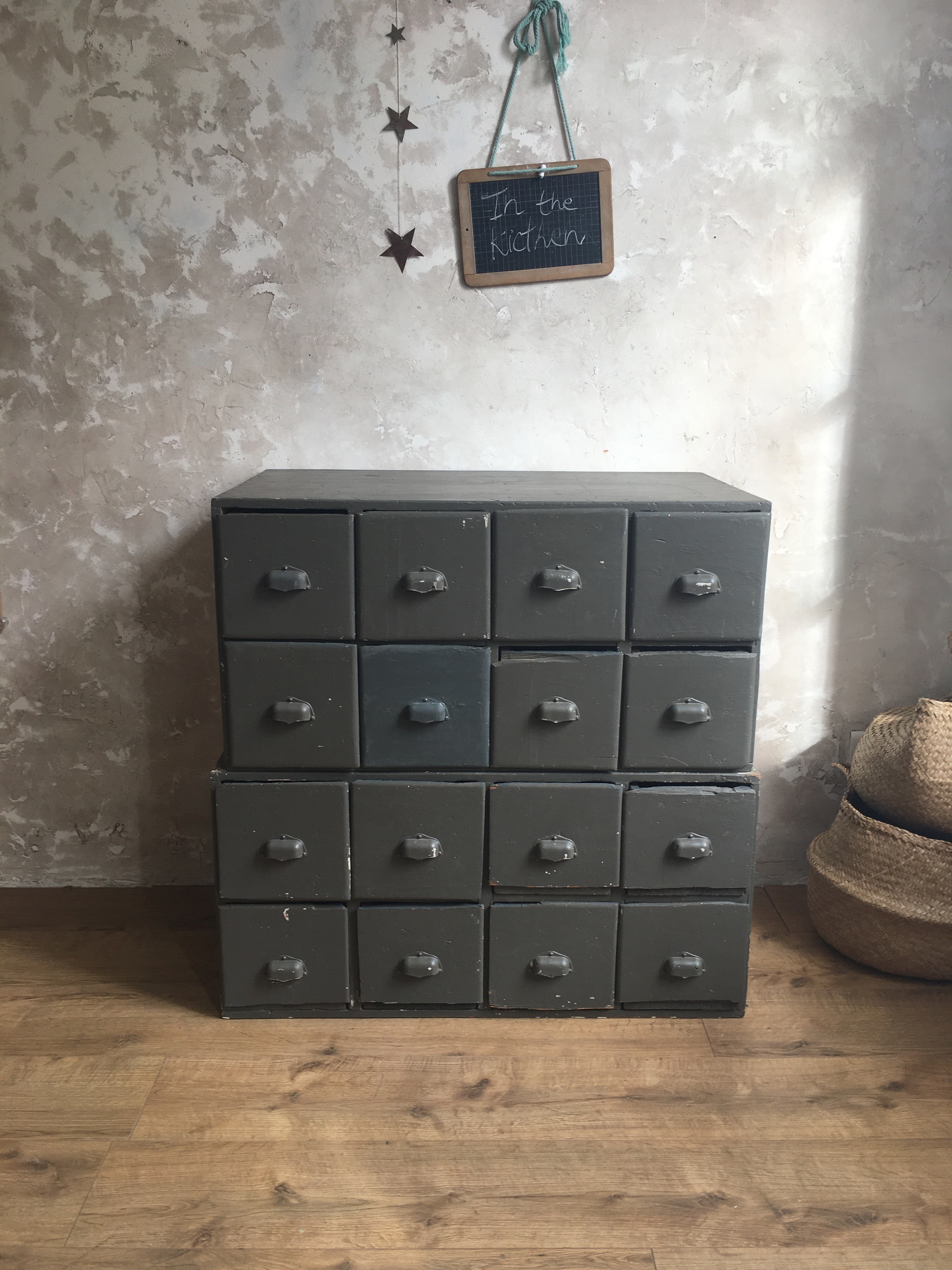 Patine grise d’origine ( il a du aussi passer par du blanc). Un de tiroirs a été repeint et le gris n’est pas du même ton.