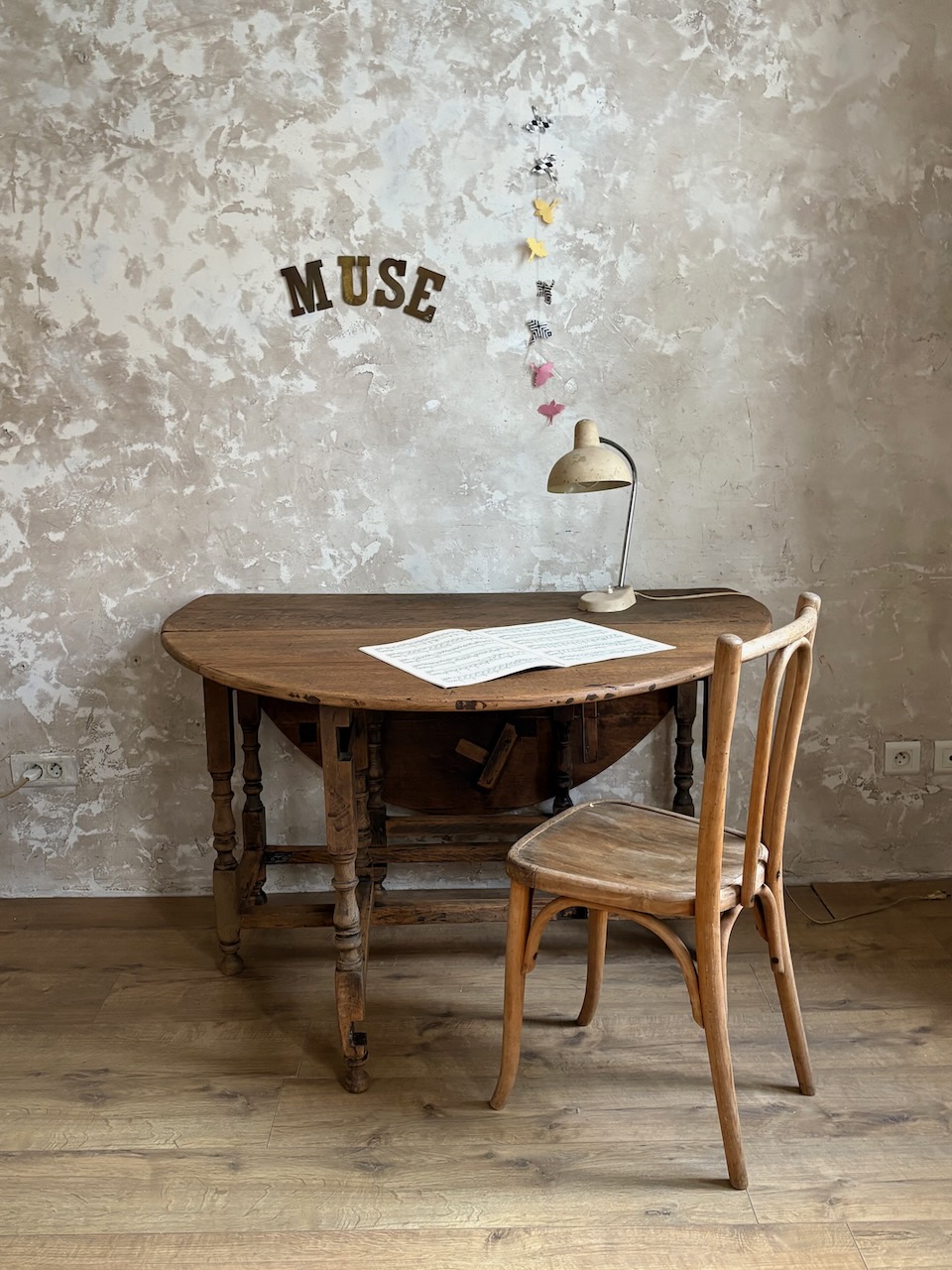 Le piètement présente des traces du temps, avec des piqûres anciennes. Par prévention contre les xylophages (même s’ils ne sont plus actifs), le bois a été traité.