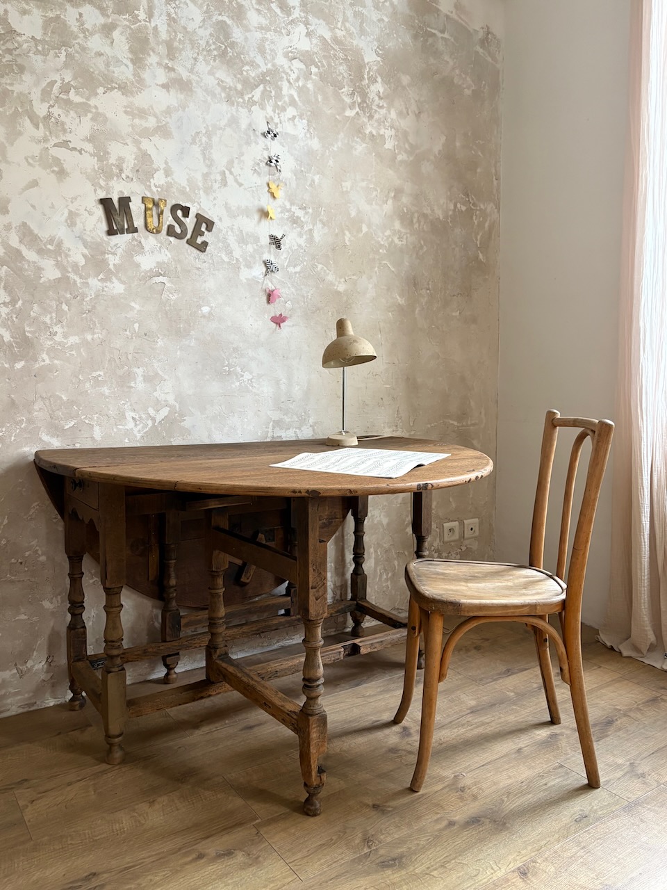 À l’origine très foncée, elle a été poncée afin de retrouver le bois brut, puis cirée pour une meilleure protection et un entretien facile.