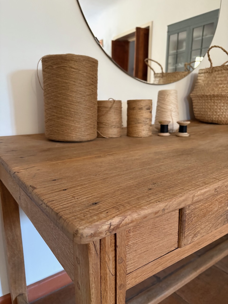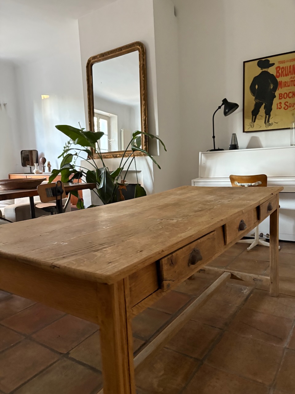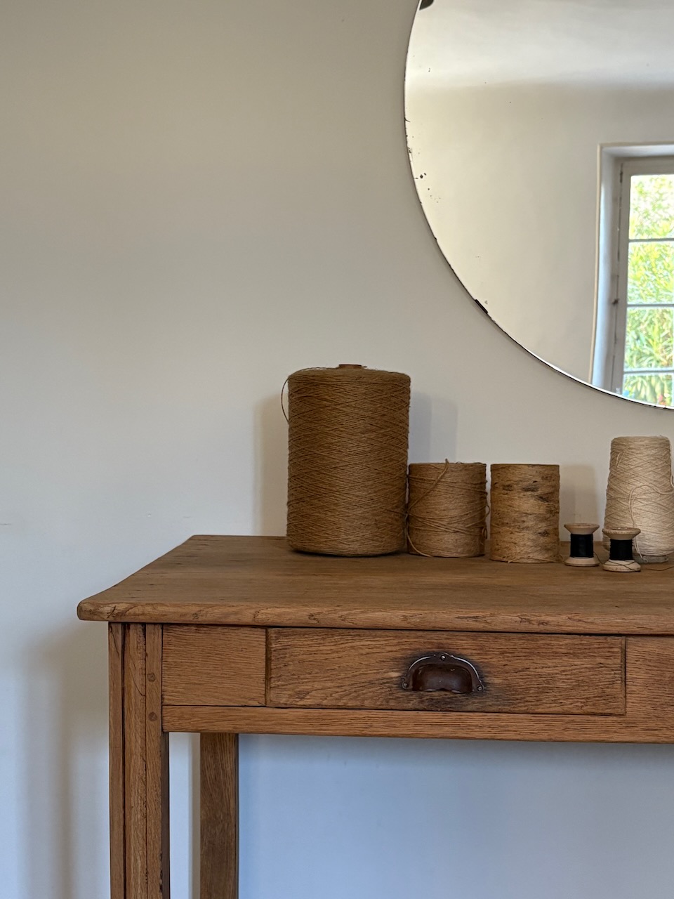 Elle est dotée de 6 tiroirs — trois de chaque côté — avec leurs poignées coquille d’origine.