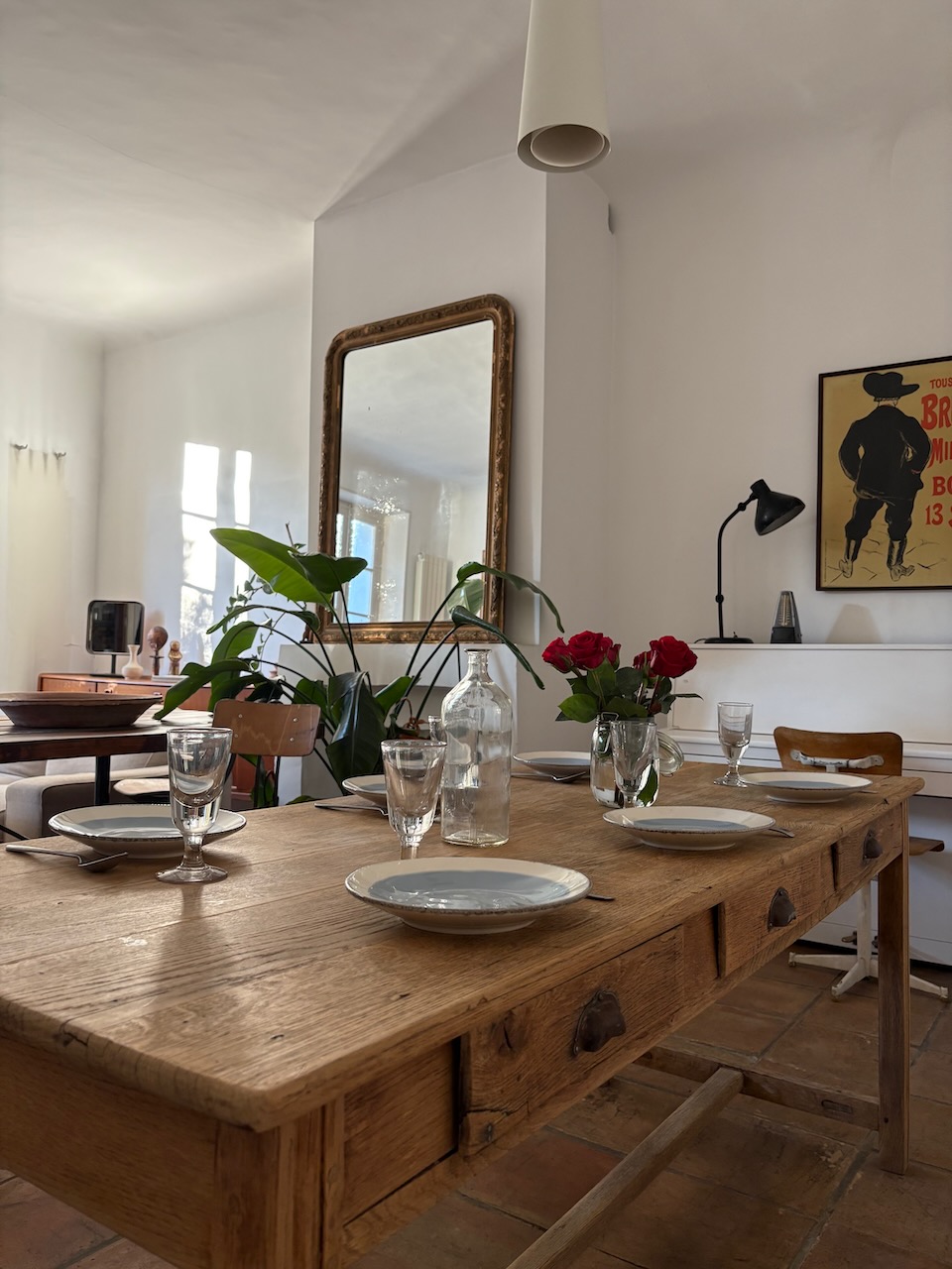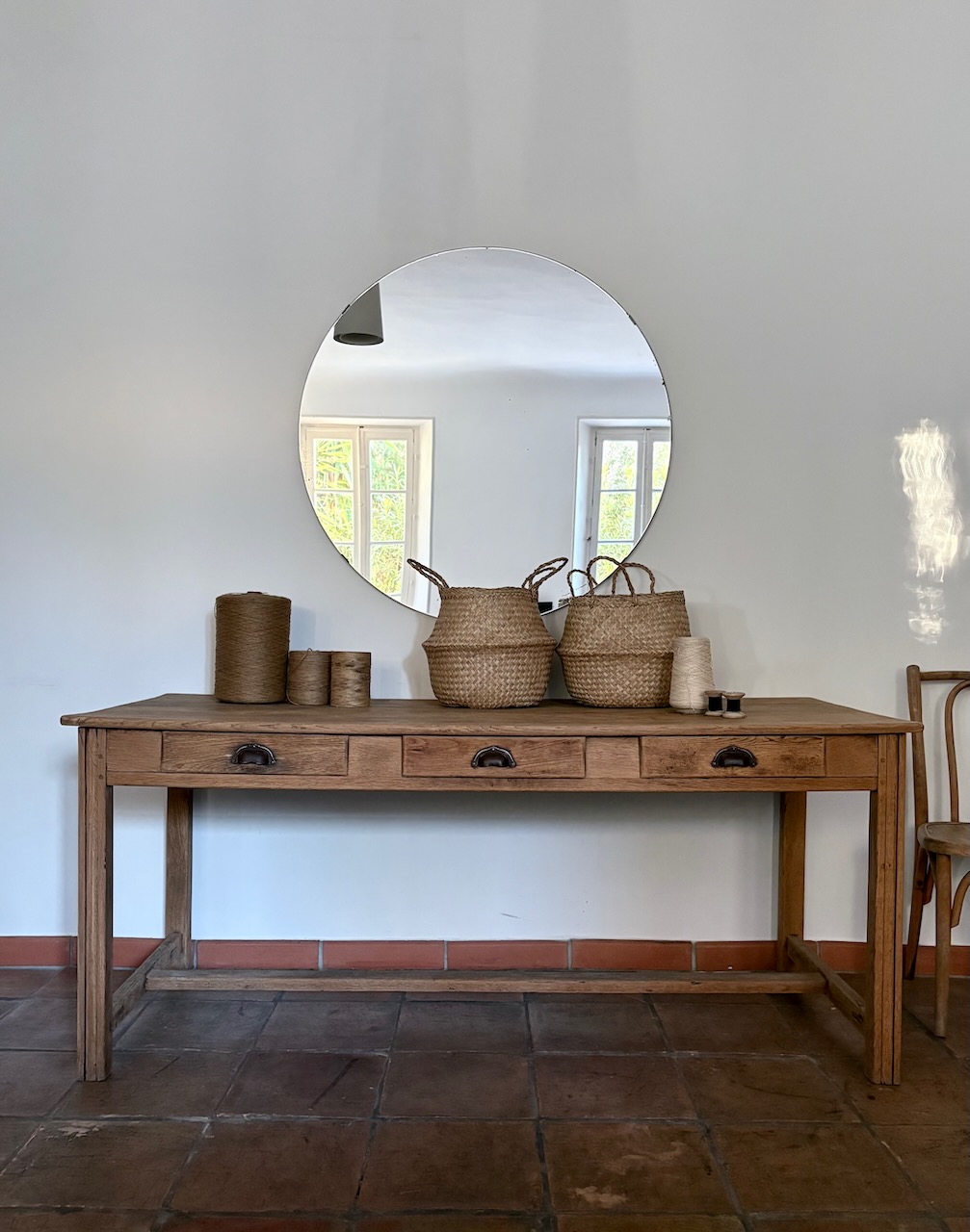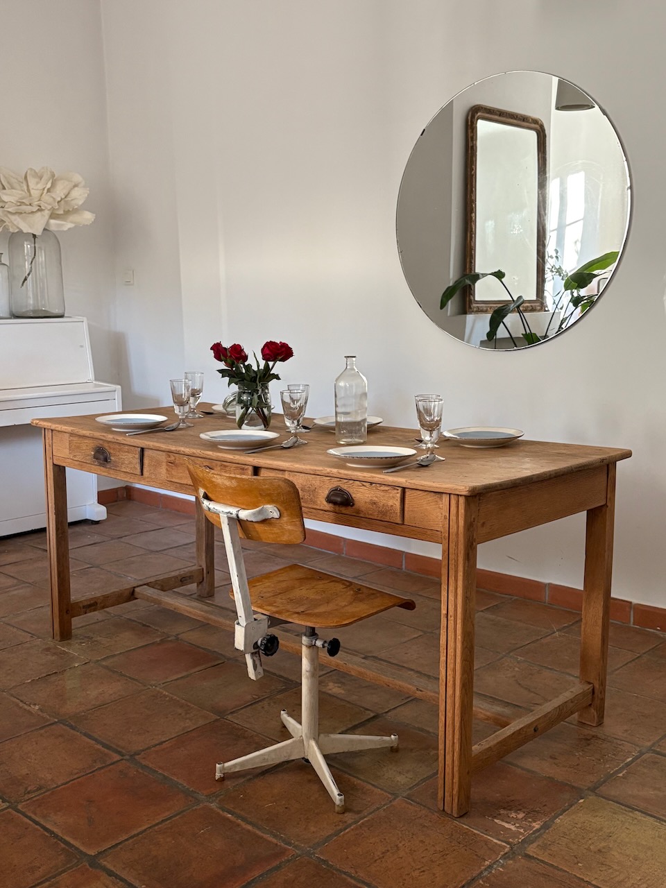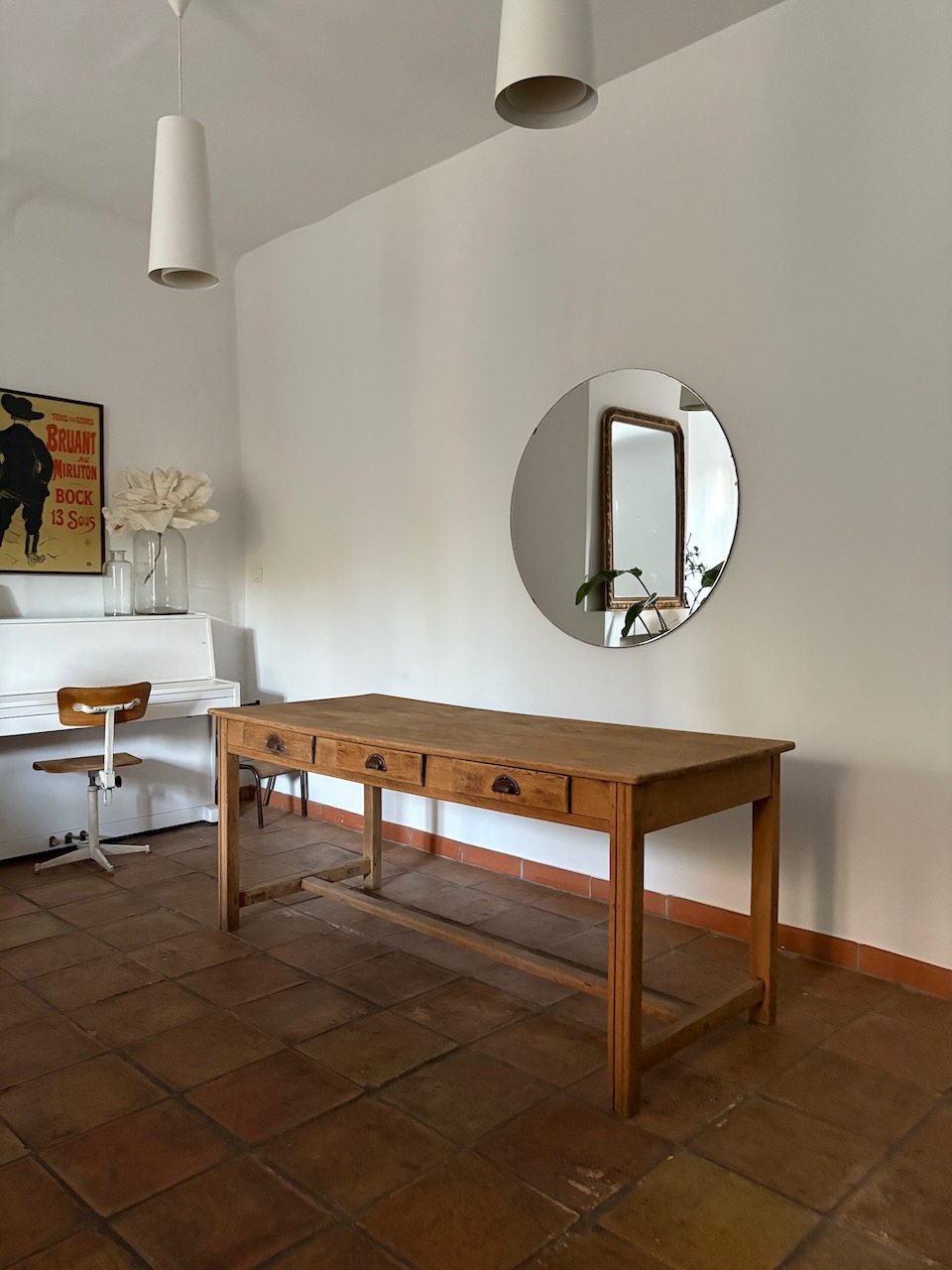 Elle est dotée de 6 tiroirs — trois de chaque côté — avec leurs poignées coquille d’origine.