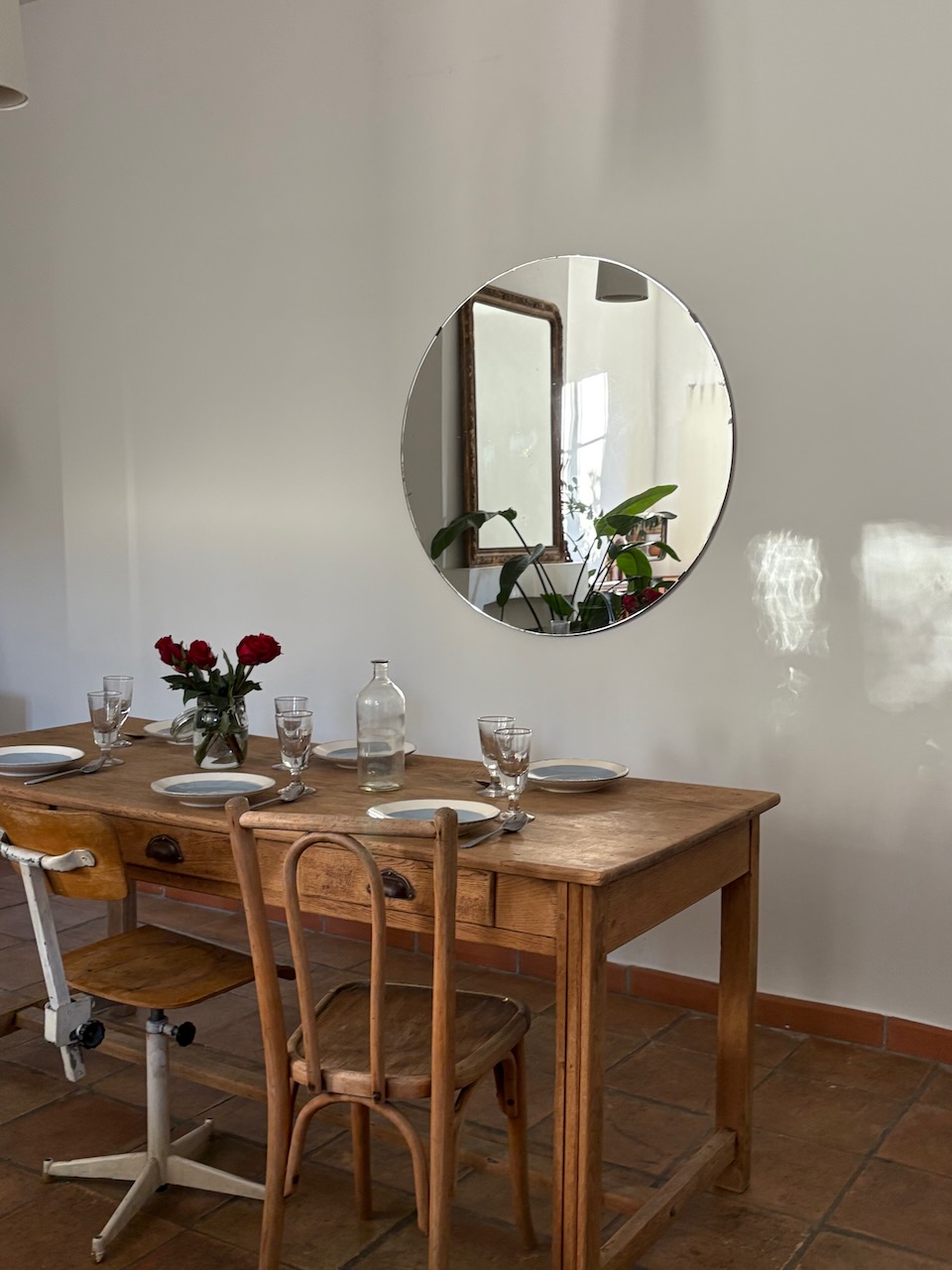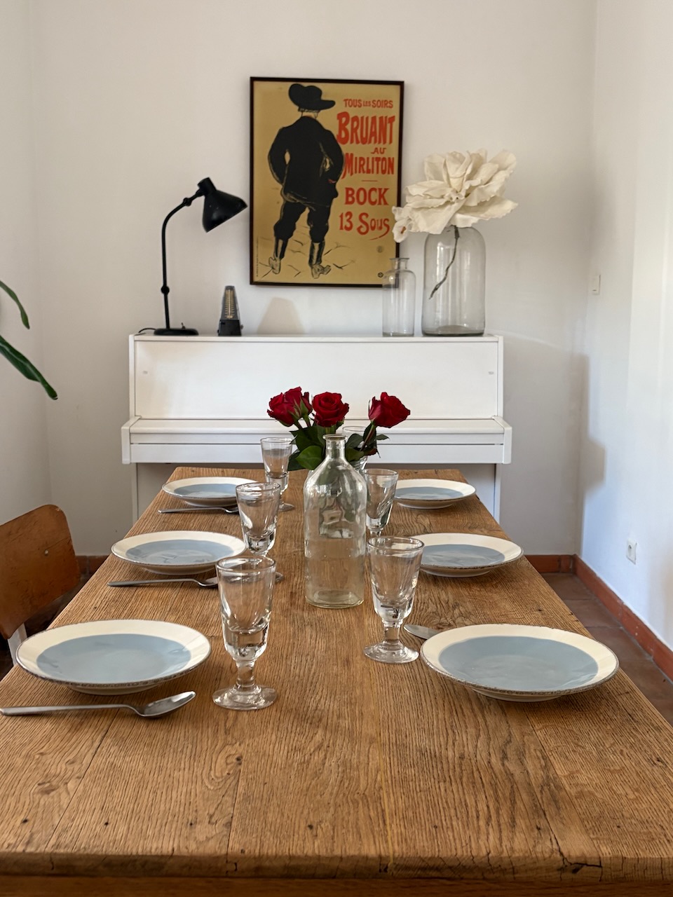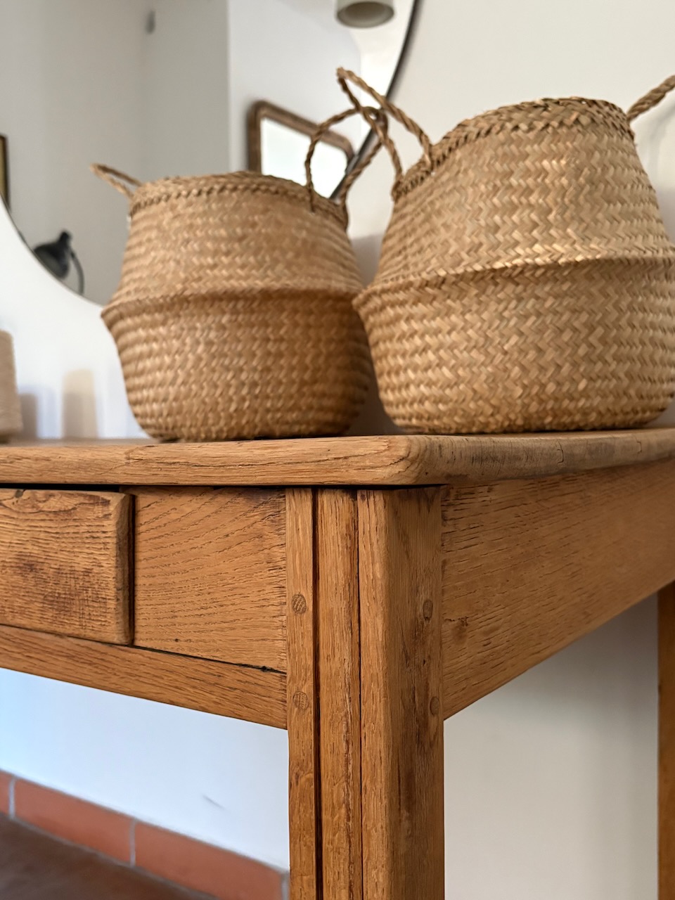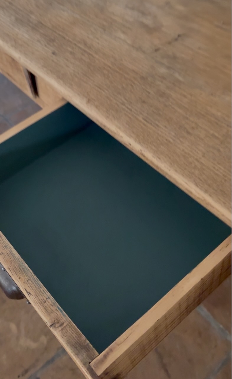 L’intérieur des tiroirs a été peint en bleu canard, une touche élégante qui met en valeur le chêne clair.