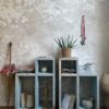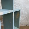 Patine bleu ciel qui laisse entrevoir une ancienne peinture crème.