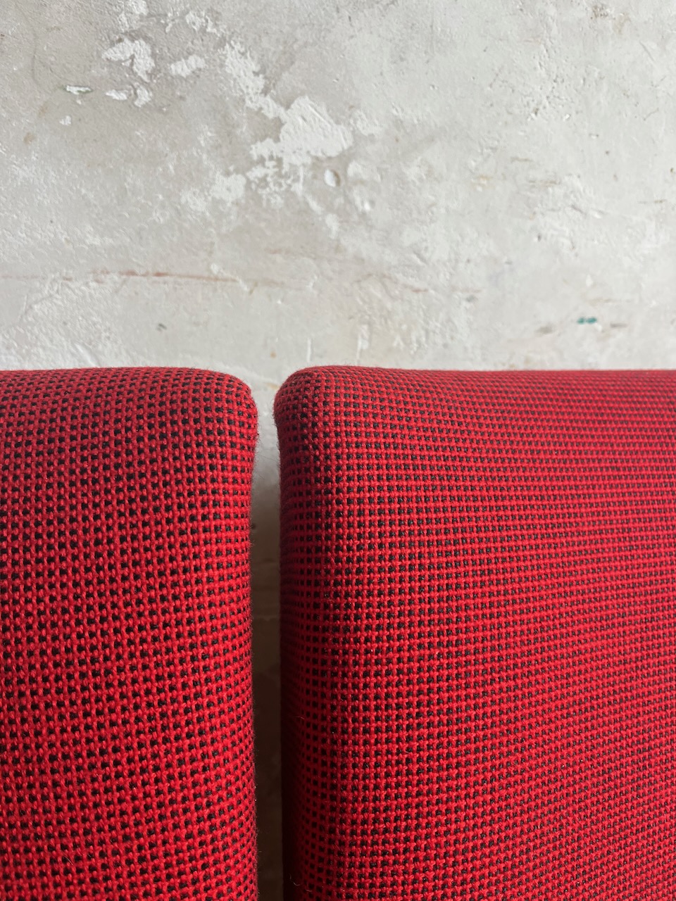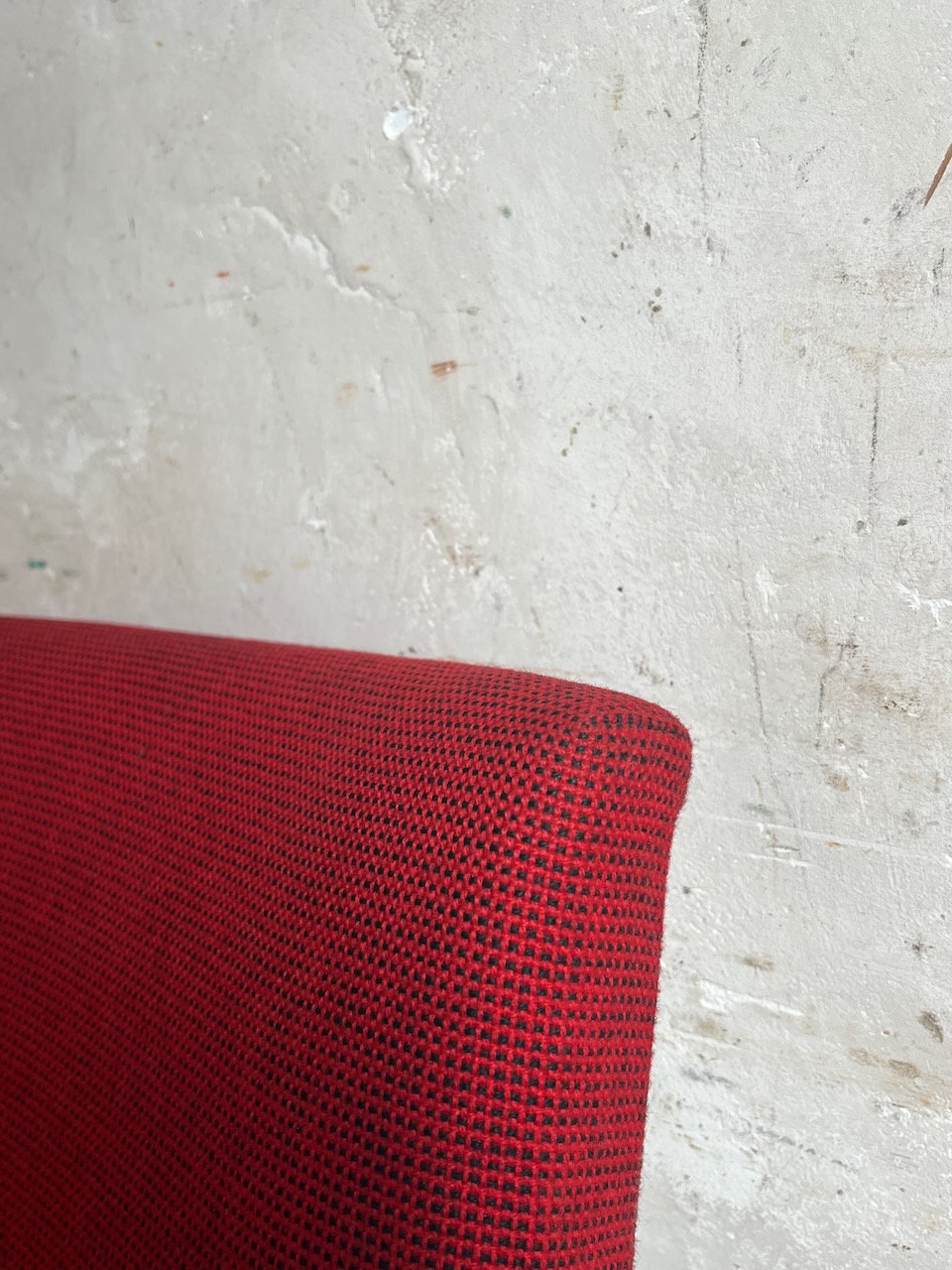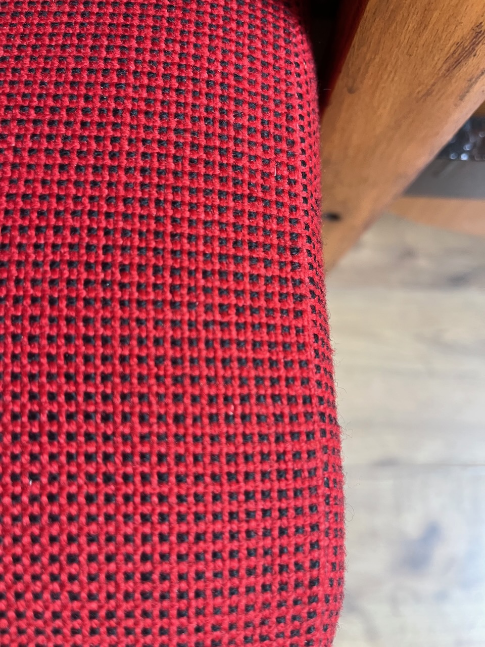 Le tissu pied-de-poule rouge et noir est en parfait état — à se demander s’il n’est pas neuf !