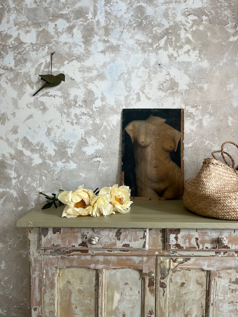 Ce buffet parisien au style unique a été entièrement retravaillé pour révéler tout son caractère. À l’origine blanc, il a été minutieusement gratté au couteau afin de faire ressortir sa patine d’origine, un magnifique vert-de-gris.
