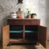 L’extérieur est dans son jus, l’intérieur de tiroirs ainsi que l’étagère du milieu sont peint en vert émeraude.