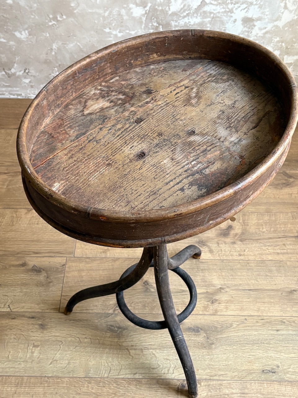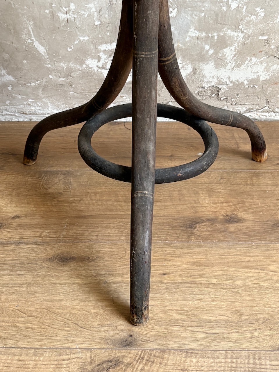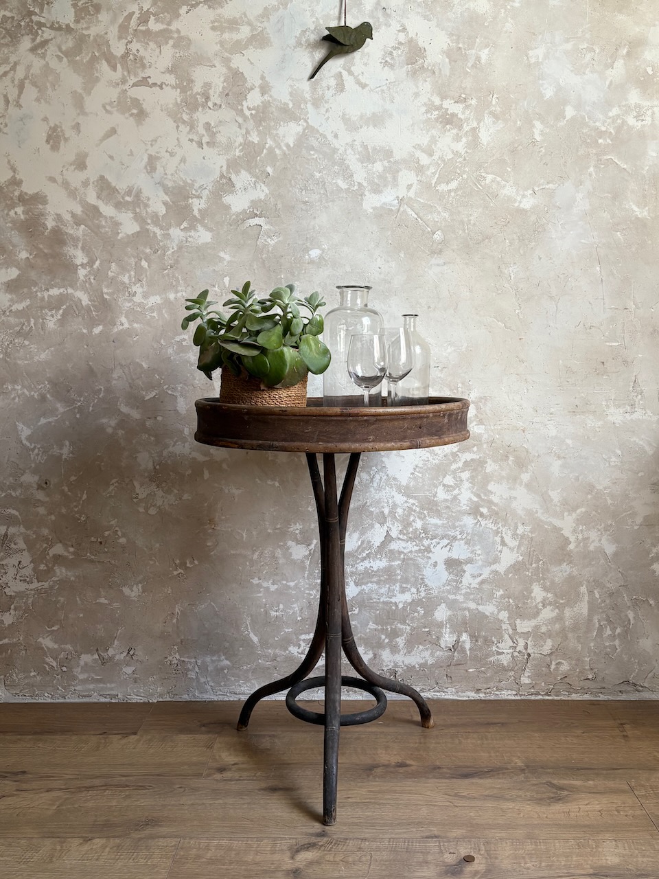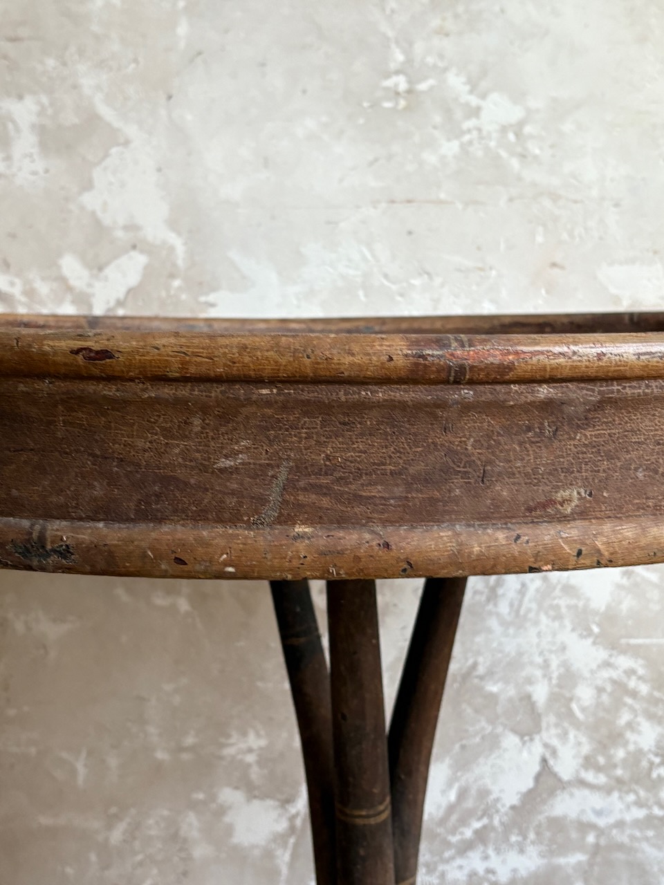 Guéridon tripode ancien en bois courbé, début XXᵉ siècle.