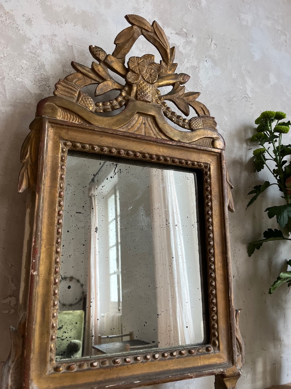 À vendre : Magnifique miroir sur pieds de style Louis XVIII, datant du XVIIIᵉ siècle. Il présente une belle patine d’époque et une glace au mercure légèrement piquée, apportant une touche de romantisme authentique.