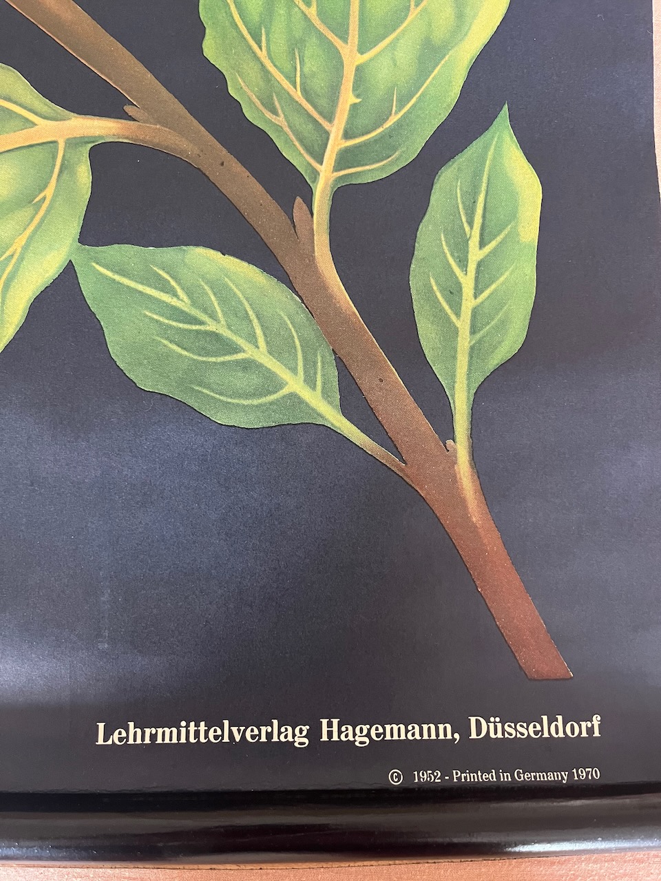 Imprimée par Hagemann (Düsseldorf), cette affiche illustre avec précision et style les thèmes botaniques destinés à l’enseignement.