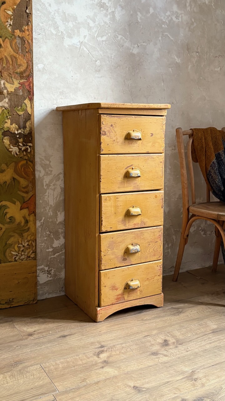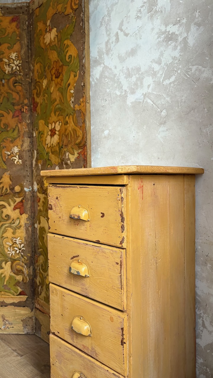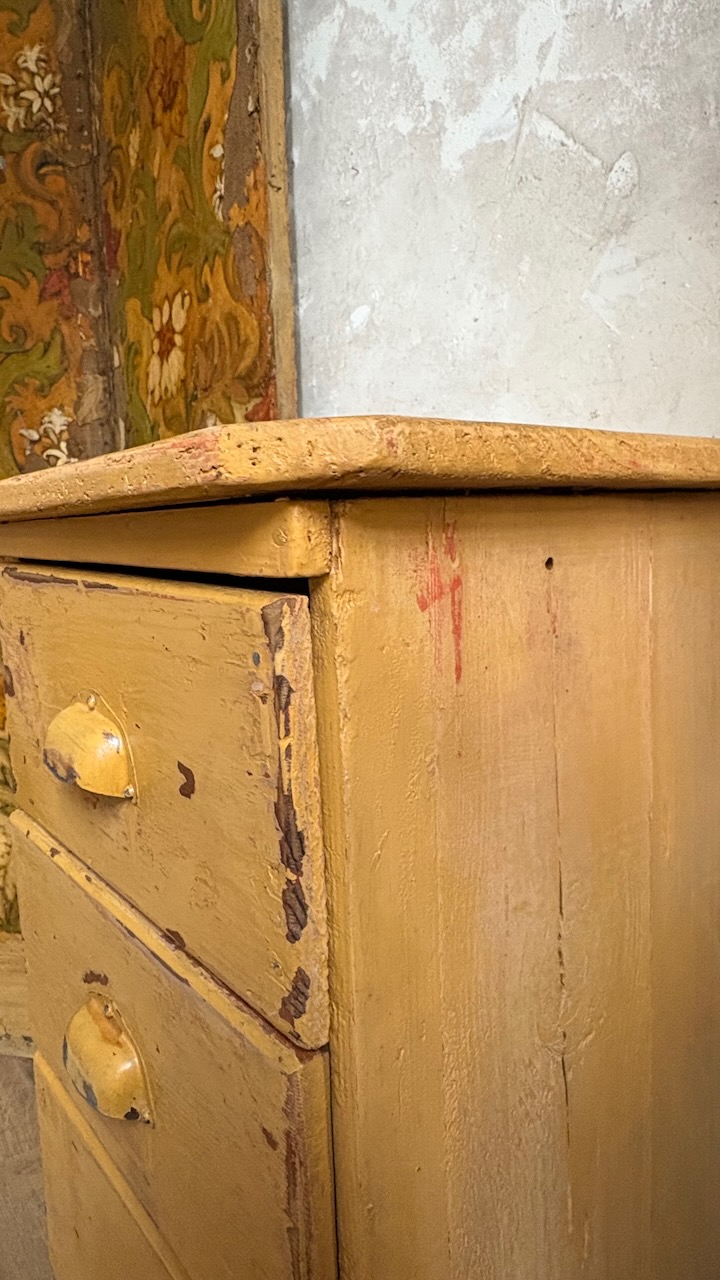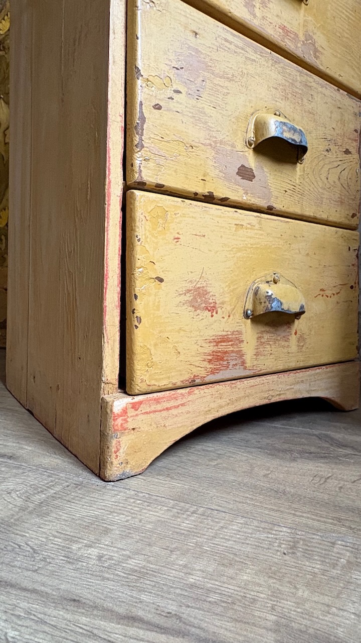 Doté de 5 tiroirs avec poignées coquille, il séduit par sa magnifique patine jaune moutarde, entièrement d’origine. Une pièce authentique, compacte et pleine de caractère – parfaite en chevet, meuble d’entrée, ou petit rangement d’atelier.