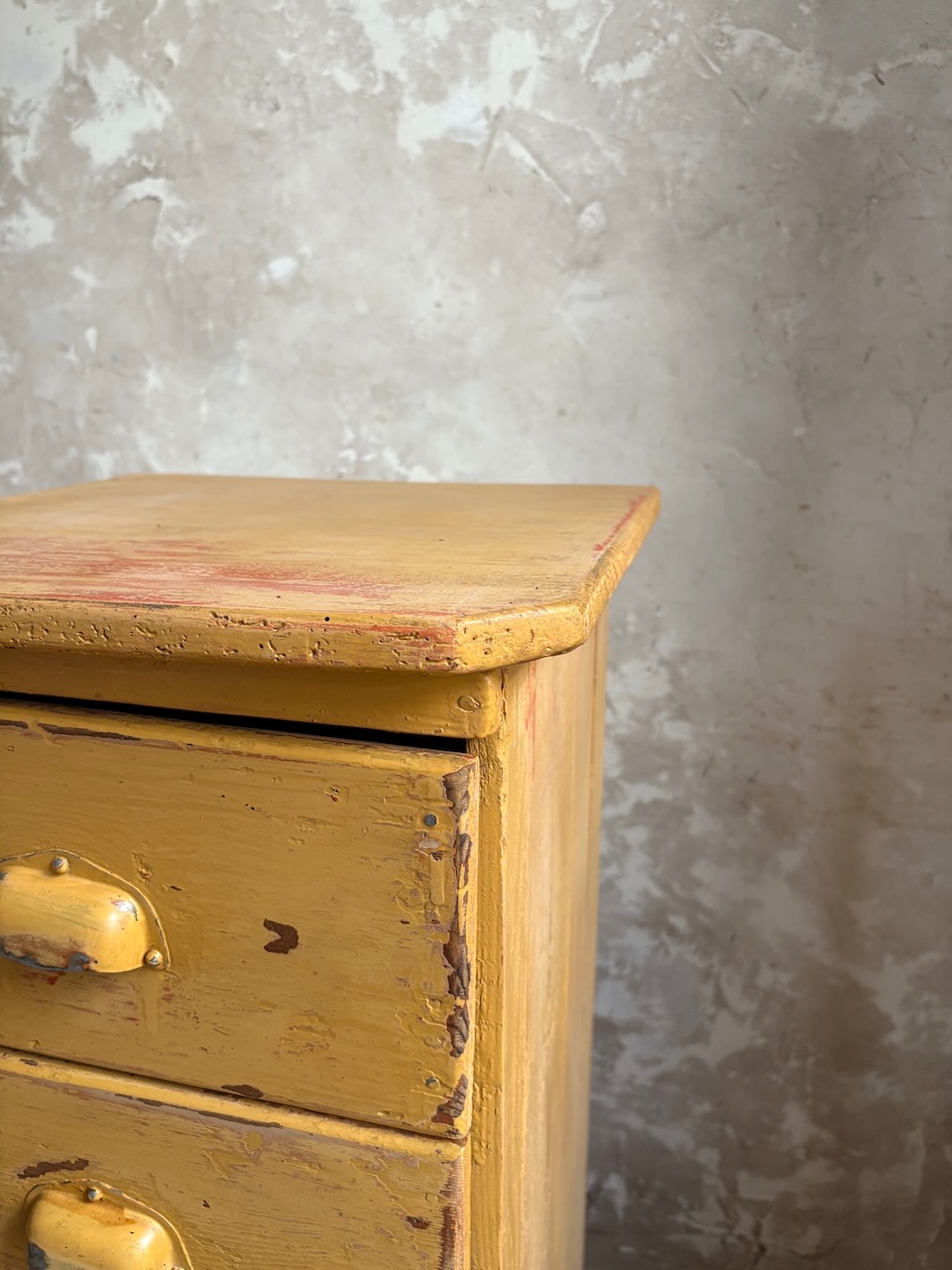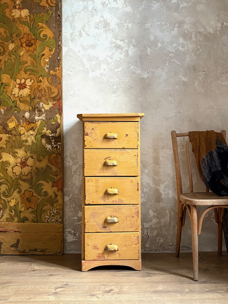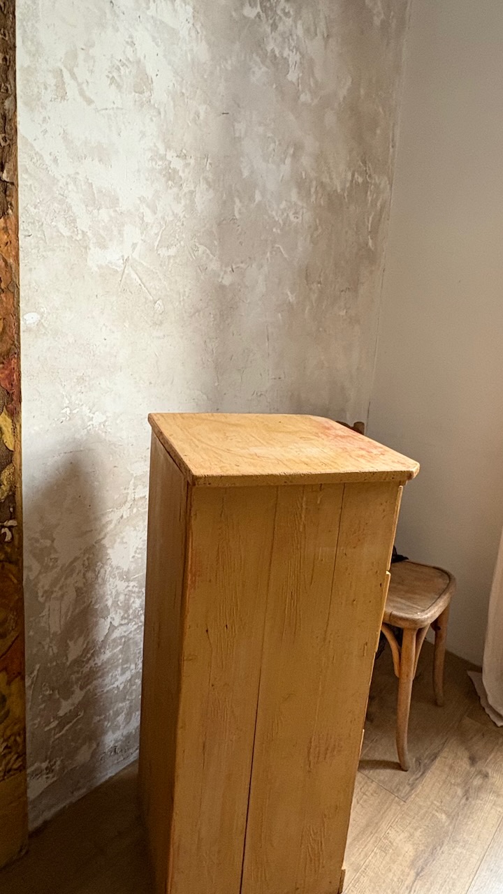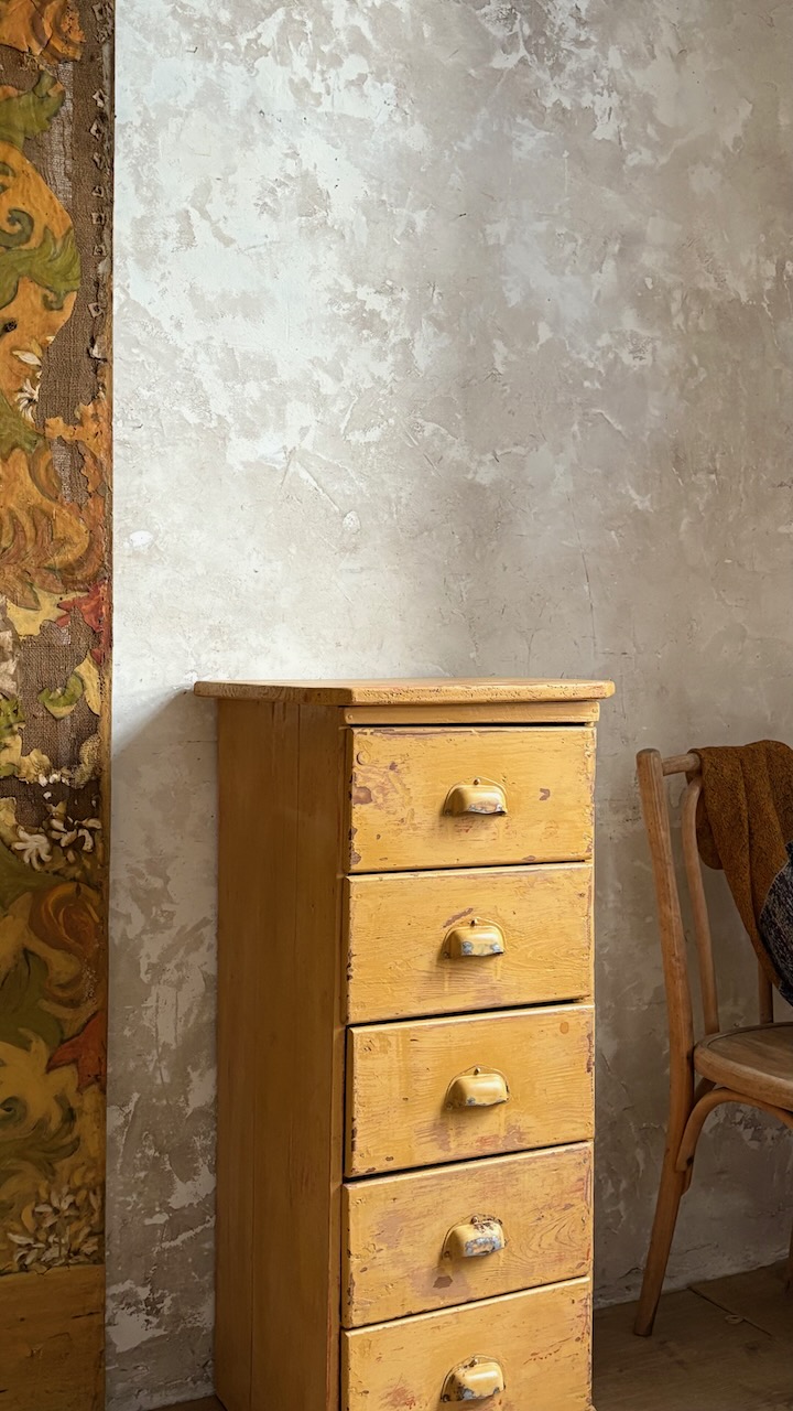 Doté de 5 tiroirs avec poignées coquille, il séduit par sa magnifique patine jaune moutarde, entièrement d’origine. Une pièce authentique, compacte et pleine de caractère – parfaite en chevet, meuble d’entrée, ou petit rangement d’atelier.