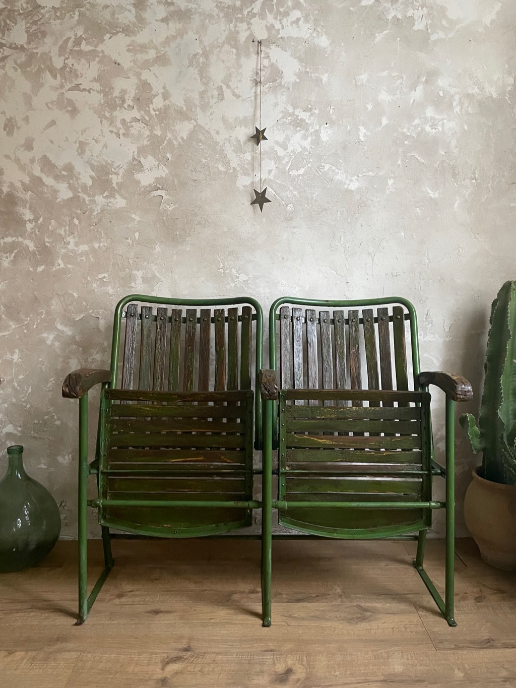 Une rangée de deux sièges, entièrement restaurée, en bois et métal.