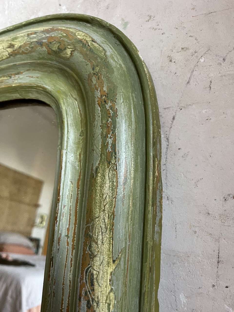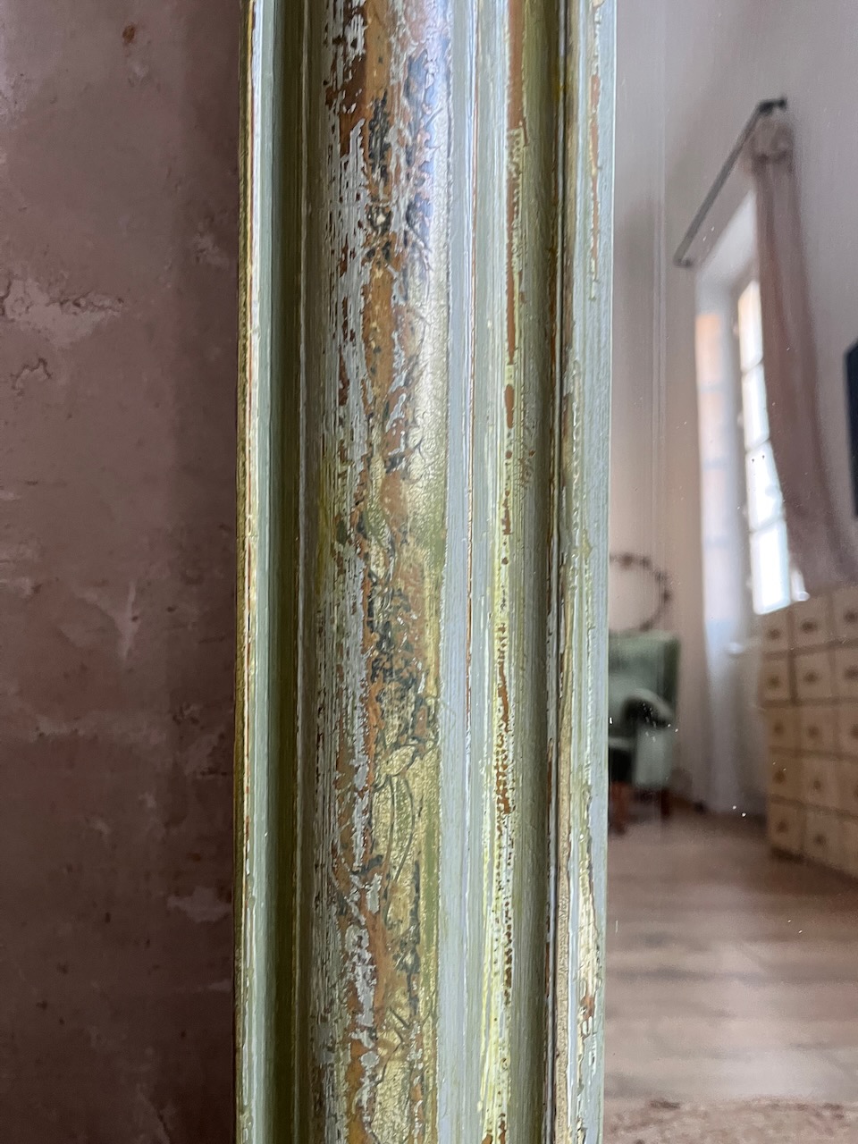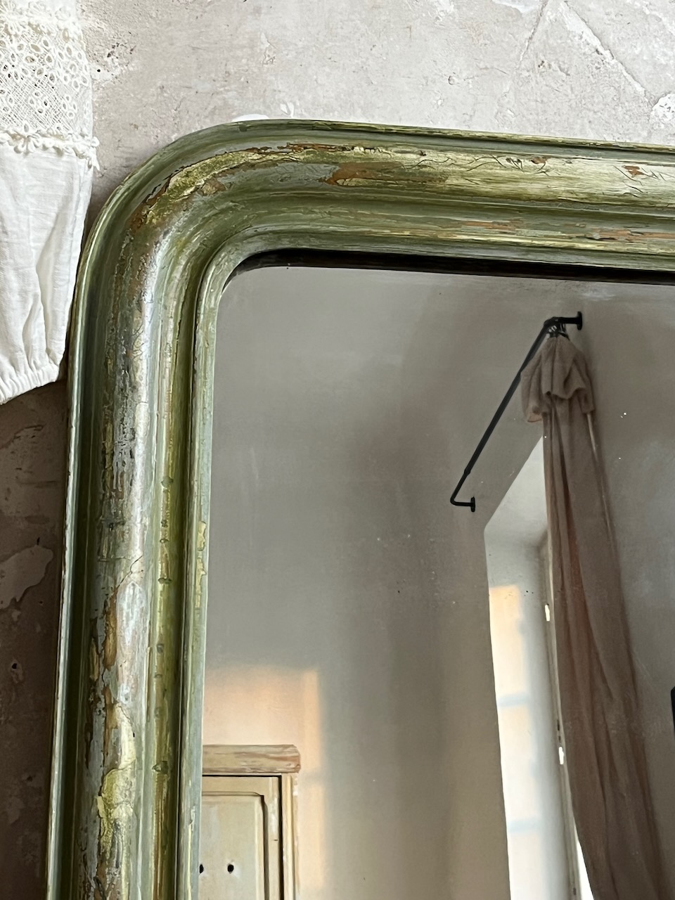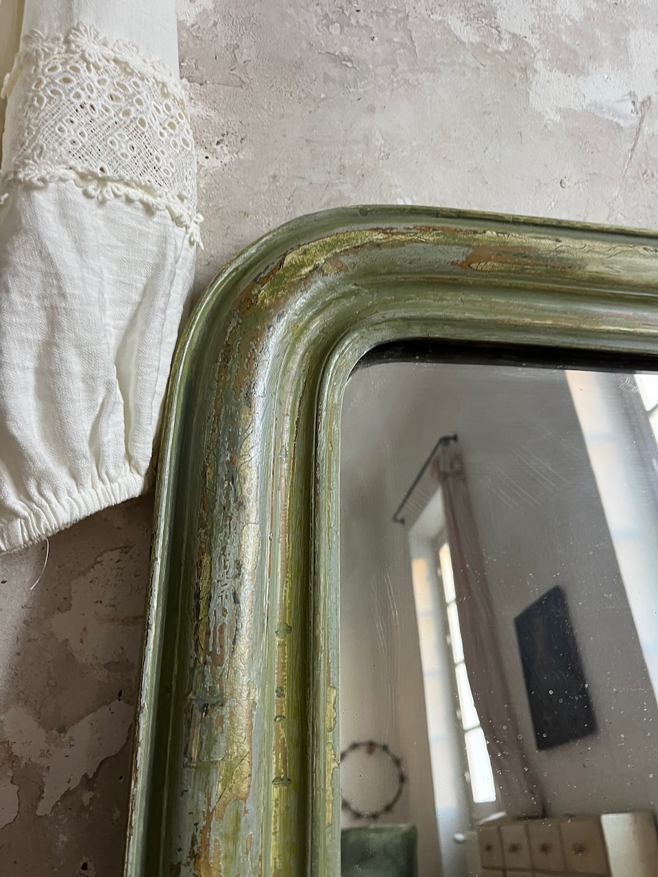 Initialement peint en blanc, il a été délicatement poncé pour faire réapparaître son ancienne argenture à la feuille, aujourd’hui presque effacée. Cette patine, retravaillée à la main puis fixée avec un vernis protecteur, lui confère un charme unique et une belle profondeur de teinte.