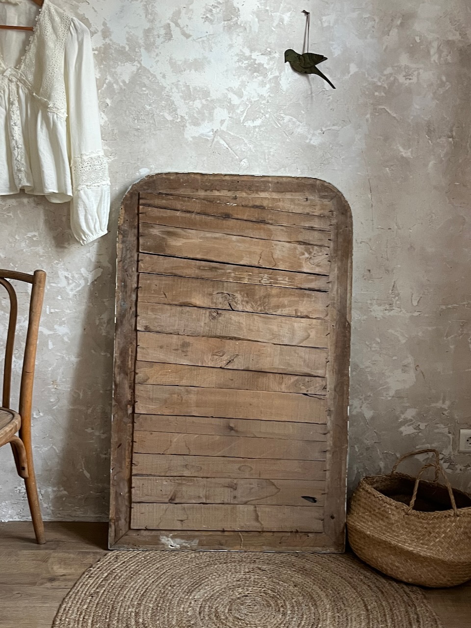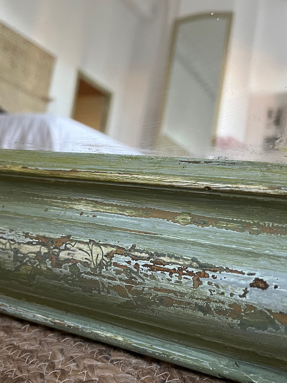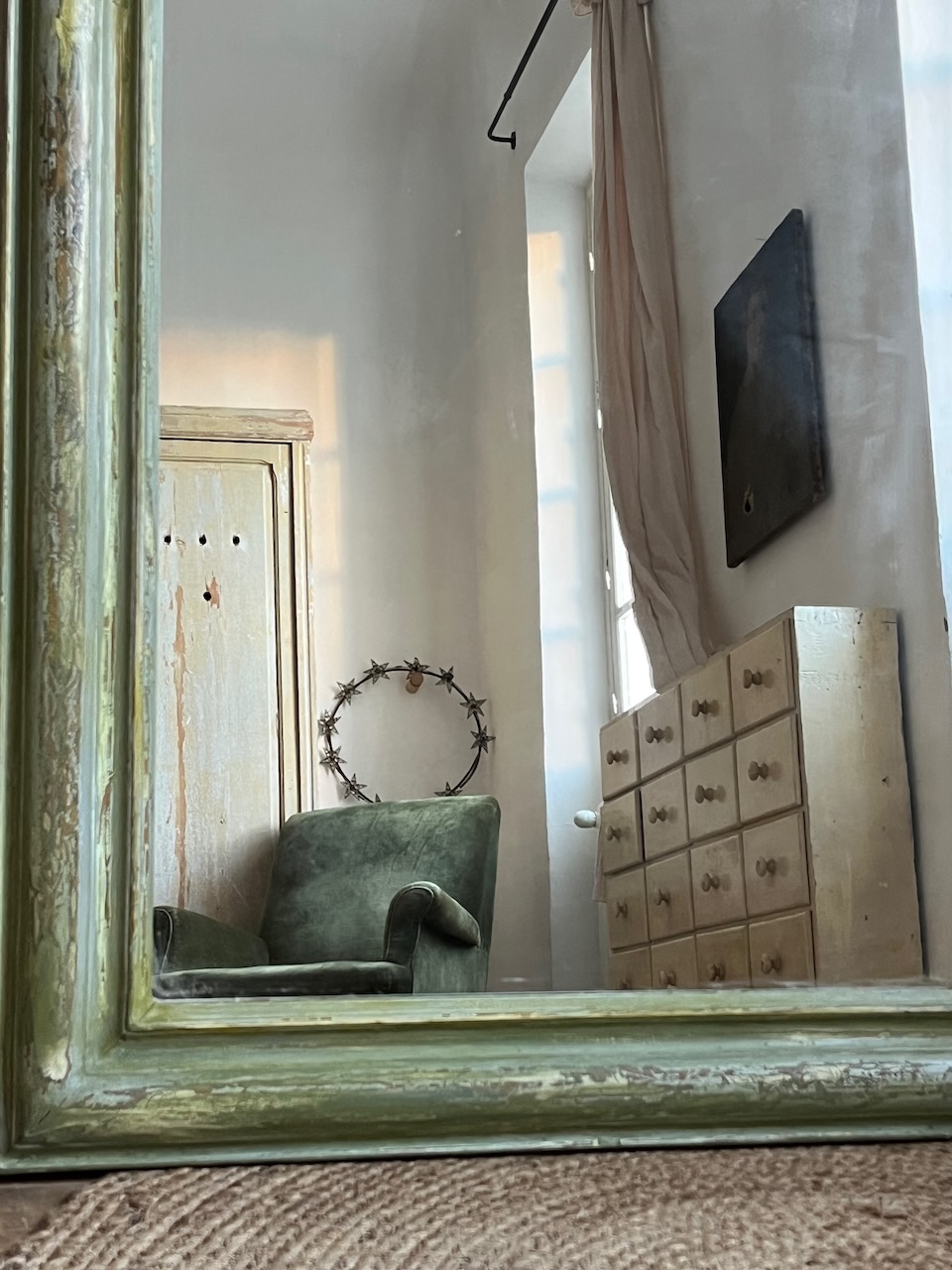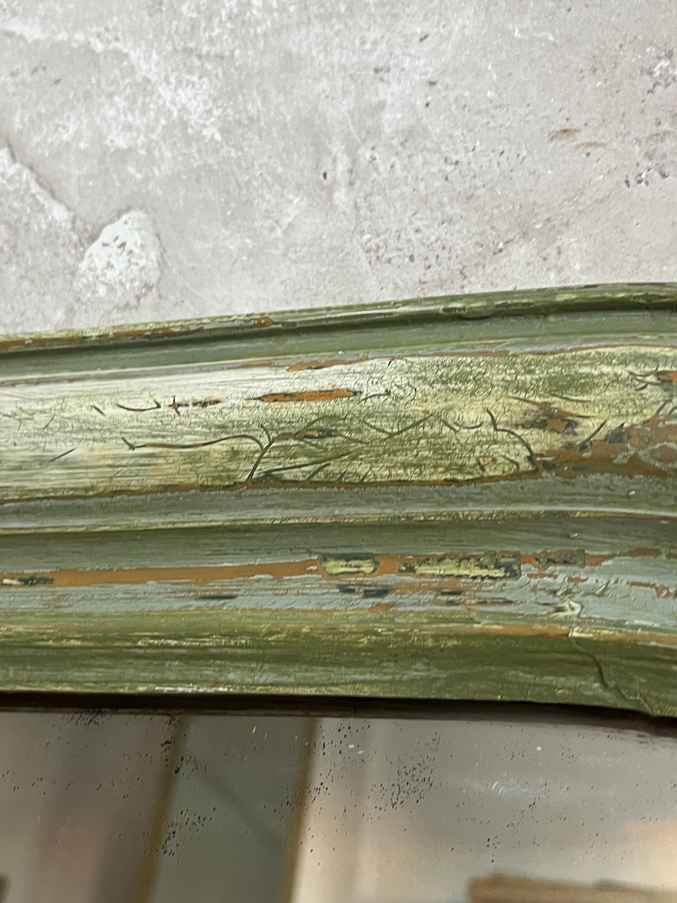 Initialement peint en blanc, il a été délicatement poncé pour faire réapparaître son ancienne argenture à la feuille, aujourd’hui presque effacée. Cette patine, retravaillée à la main puis fixée avec un vernis protecteur, lui confère un charme unique et une belle profondeur de teinte.