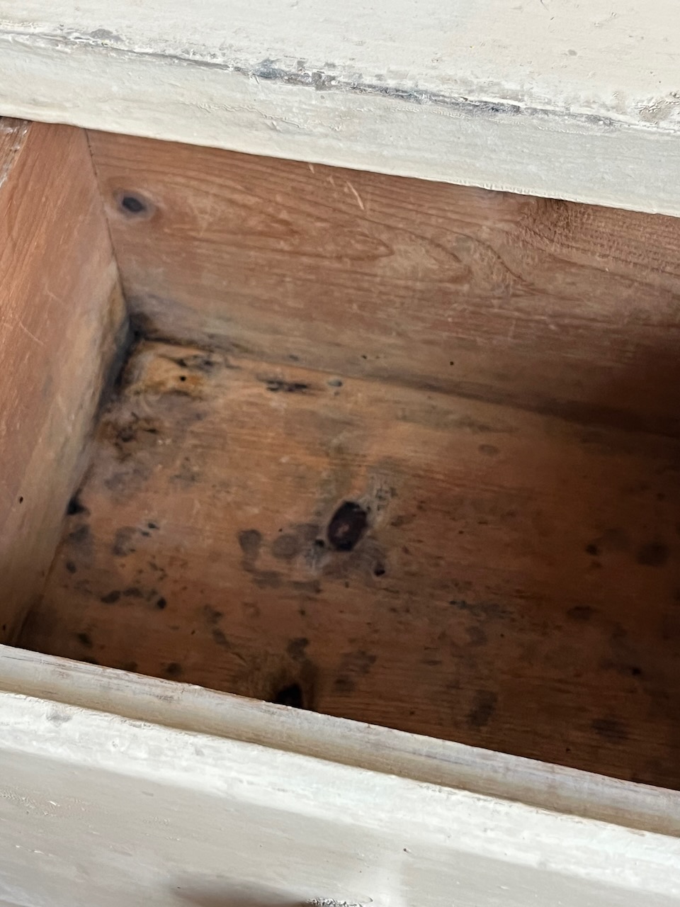 L’intérieur des tiroirs qui est piqué, a été entièrement traité au Xylophène (deux couches).
