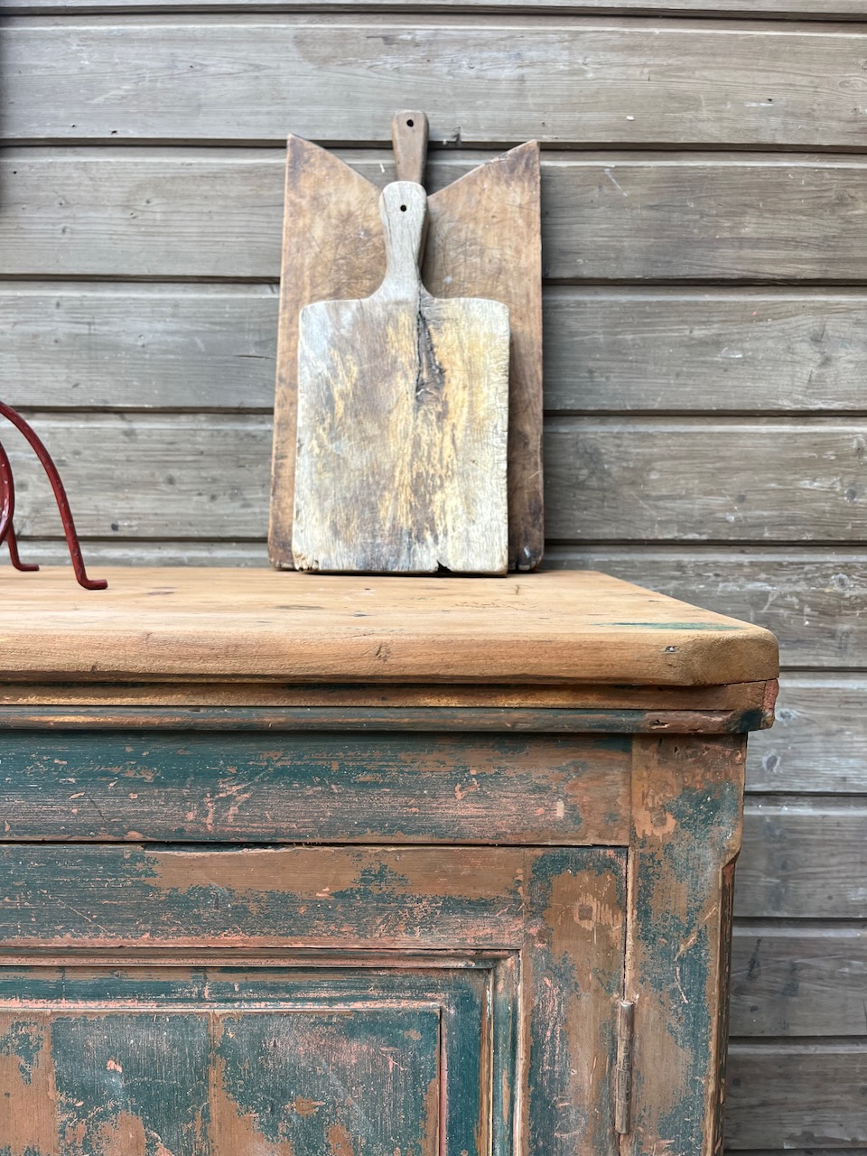 Il a été entièrement poncé, avec un nettoyage en profondeur de l’intérieur, et un légère ponçage de l’extérieur, initialement peint en vert sapin foncé, pour faire ressortir les marques du temps et sa magnifique patine, rehaussée d’une touche de pigments naturels.