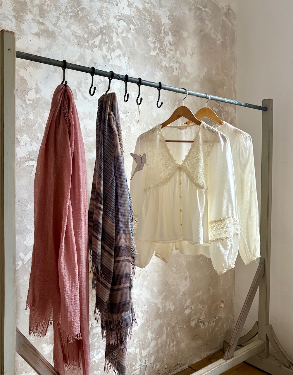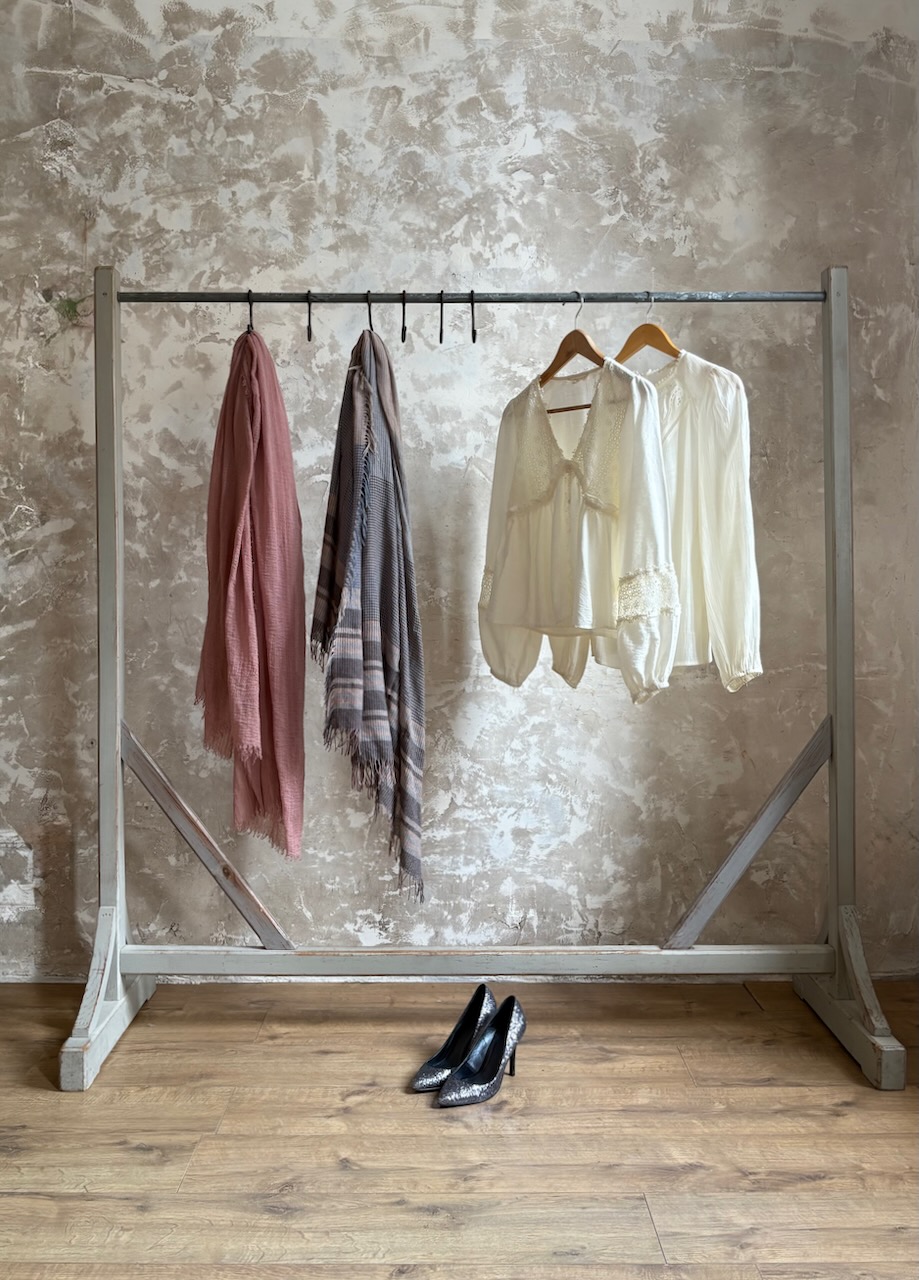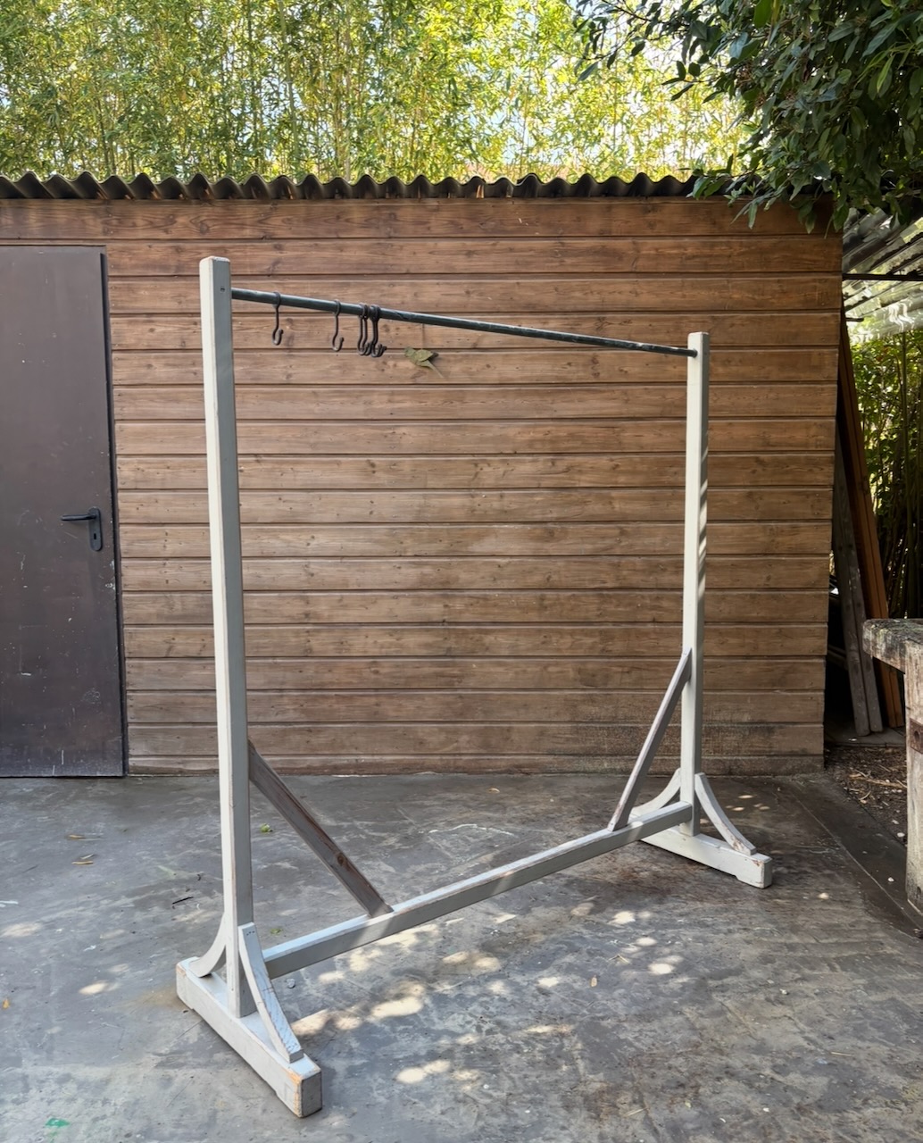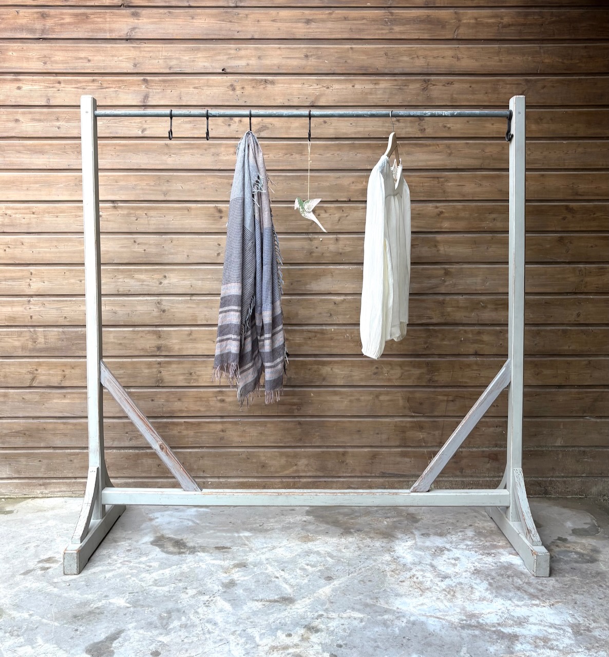 Ancien portant à vêtements datant du XXe siècle, en métal et bois, avec une ancienne patine d’origine gris clair pleine de charme. Il est doté de 6 crochets en acier d’origine, parfaits pour accrocher sacs à main, foulards ou accessoires.