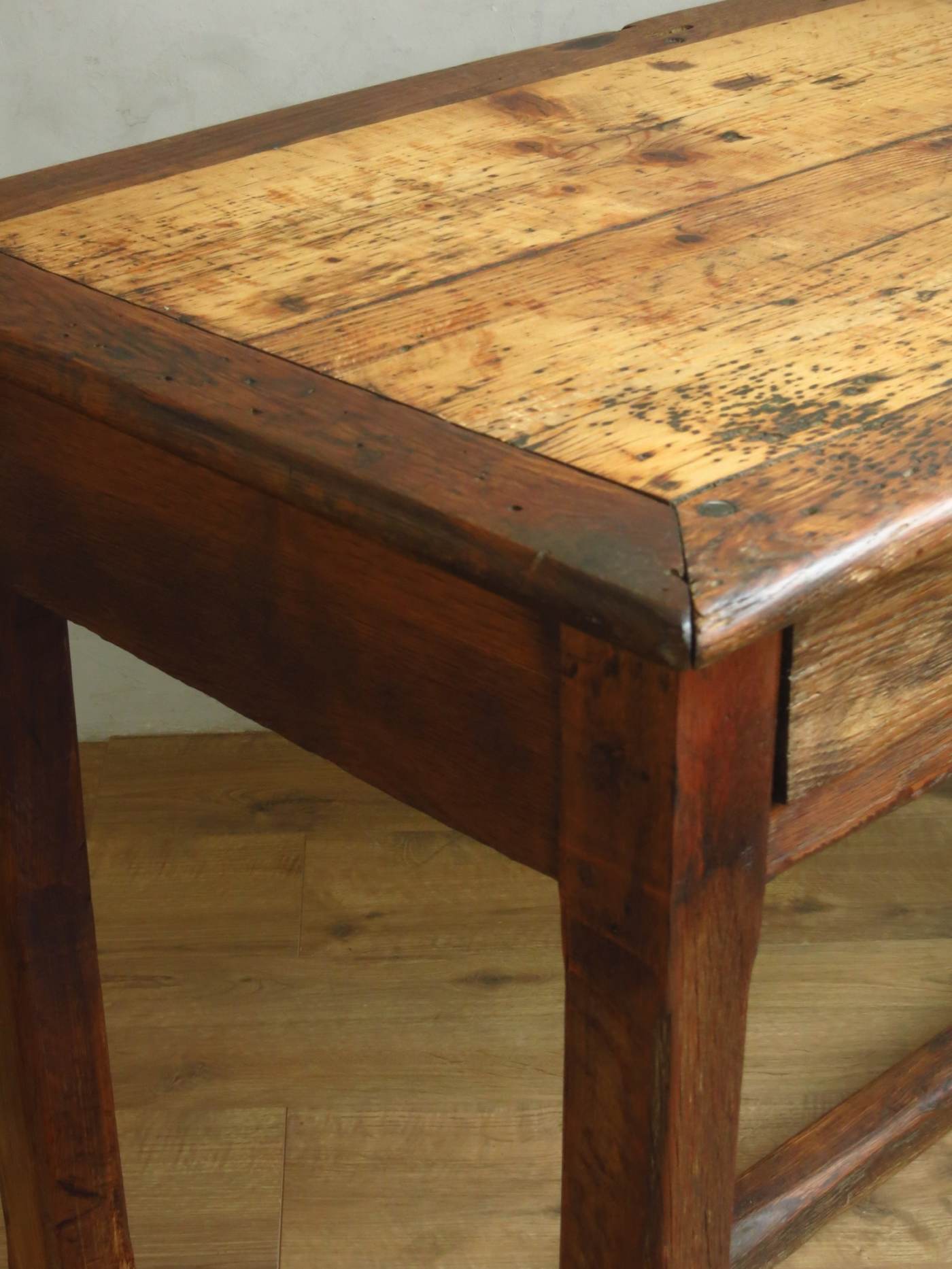 Le ton du bois est superbe, on aperçoit sur le plateau deux anciennes rosaces en témoignage du temps qui passe, et deux trous ou était surement installés des outils ou des lampes.