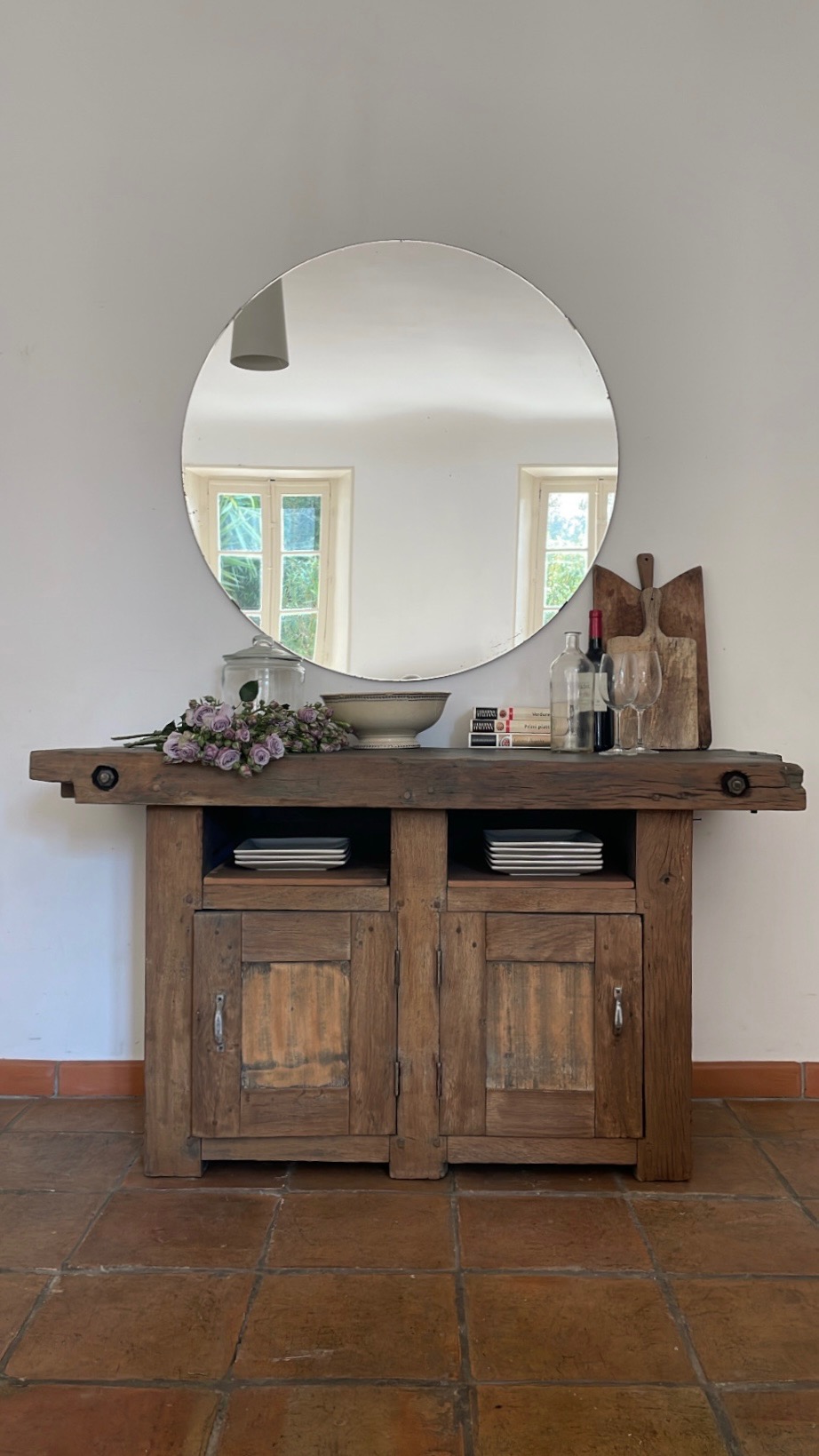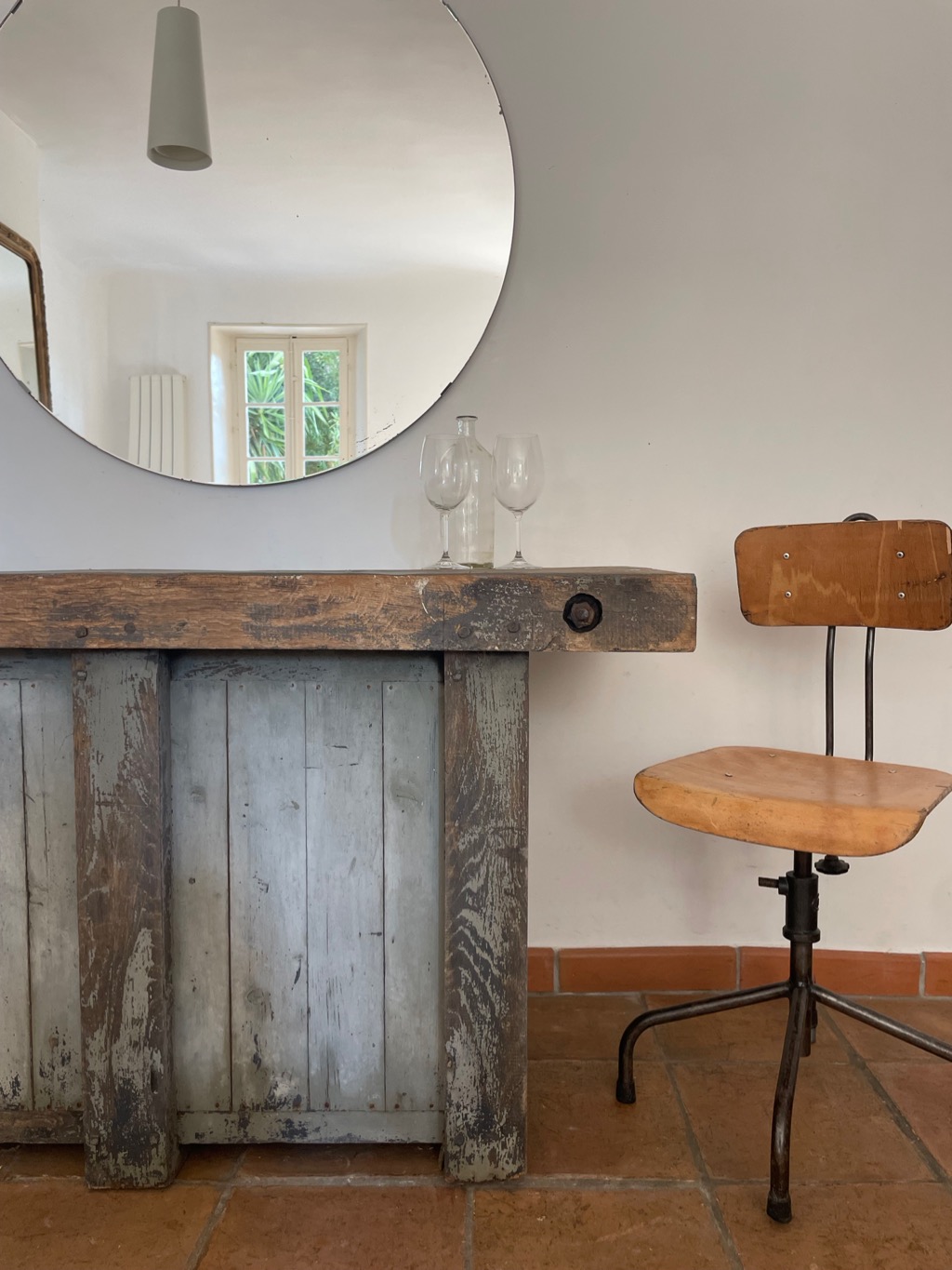 Il peut être utilisé comme ilot central car le derrière est aussi joli que le devant, dans sa charmante patine gris bleuté d’origine.