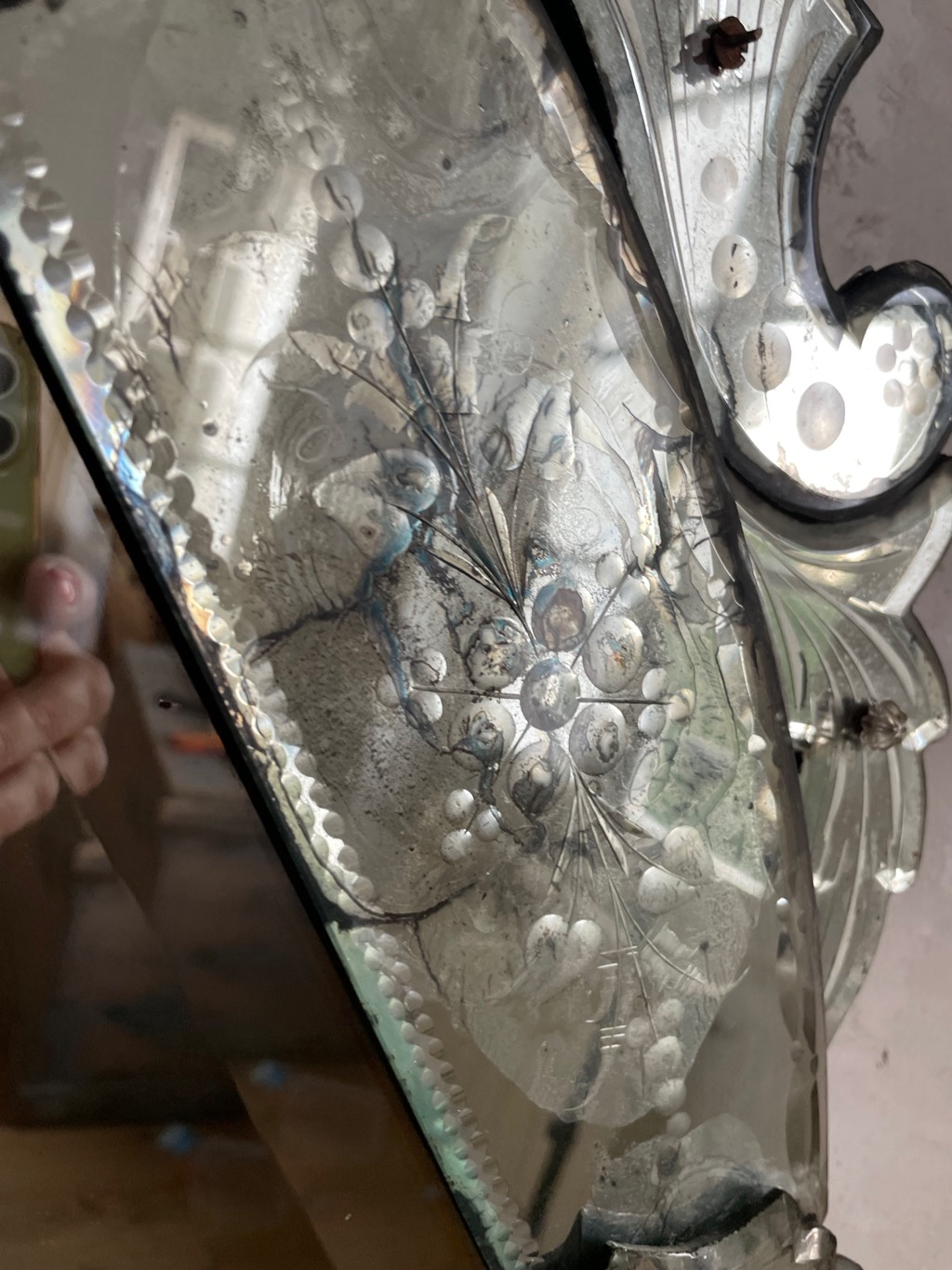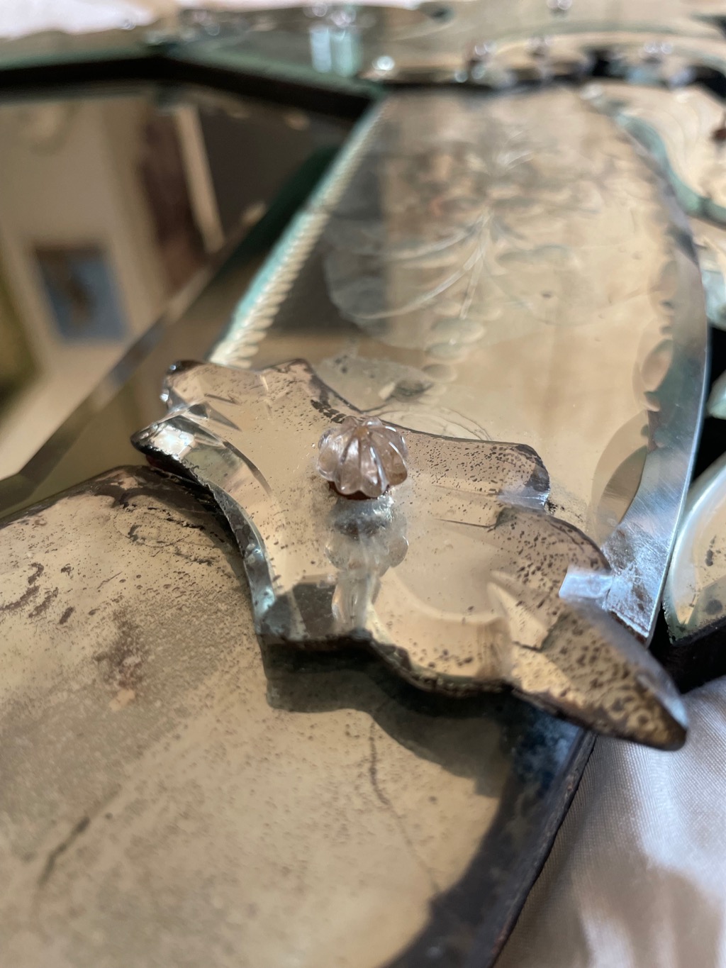 Chaque miroir est fixé avec une vis couverte d’un joli bouton en verre (ils en manquent deux)