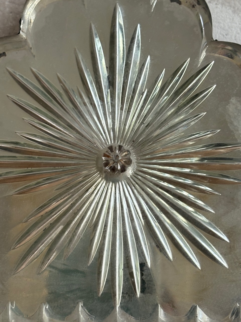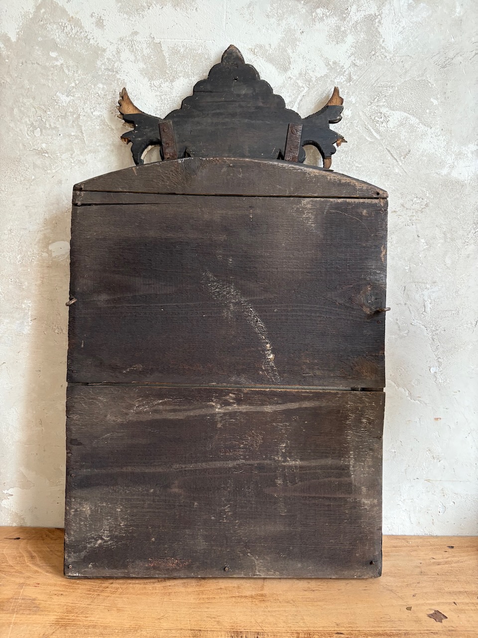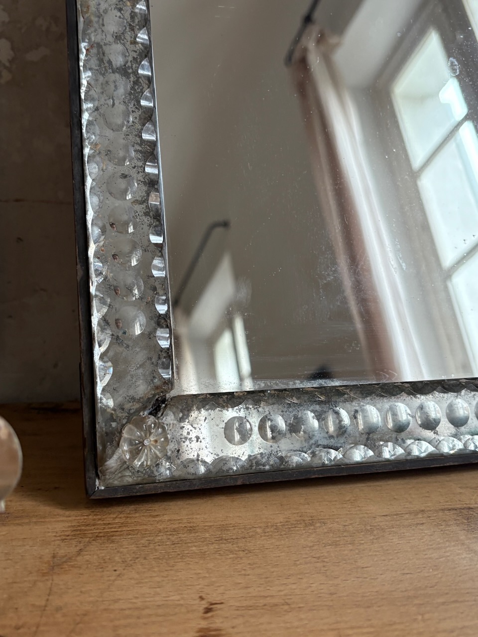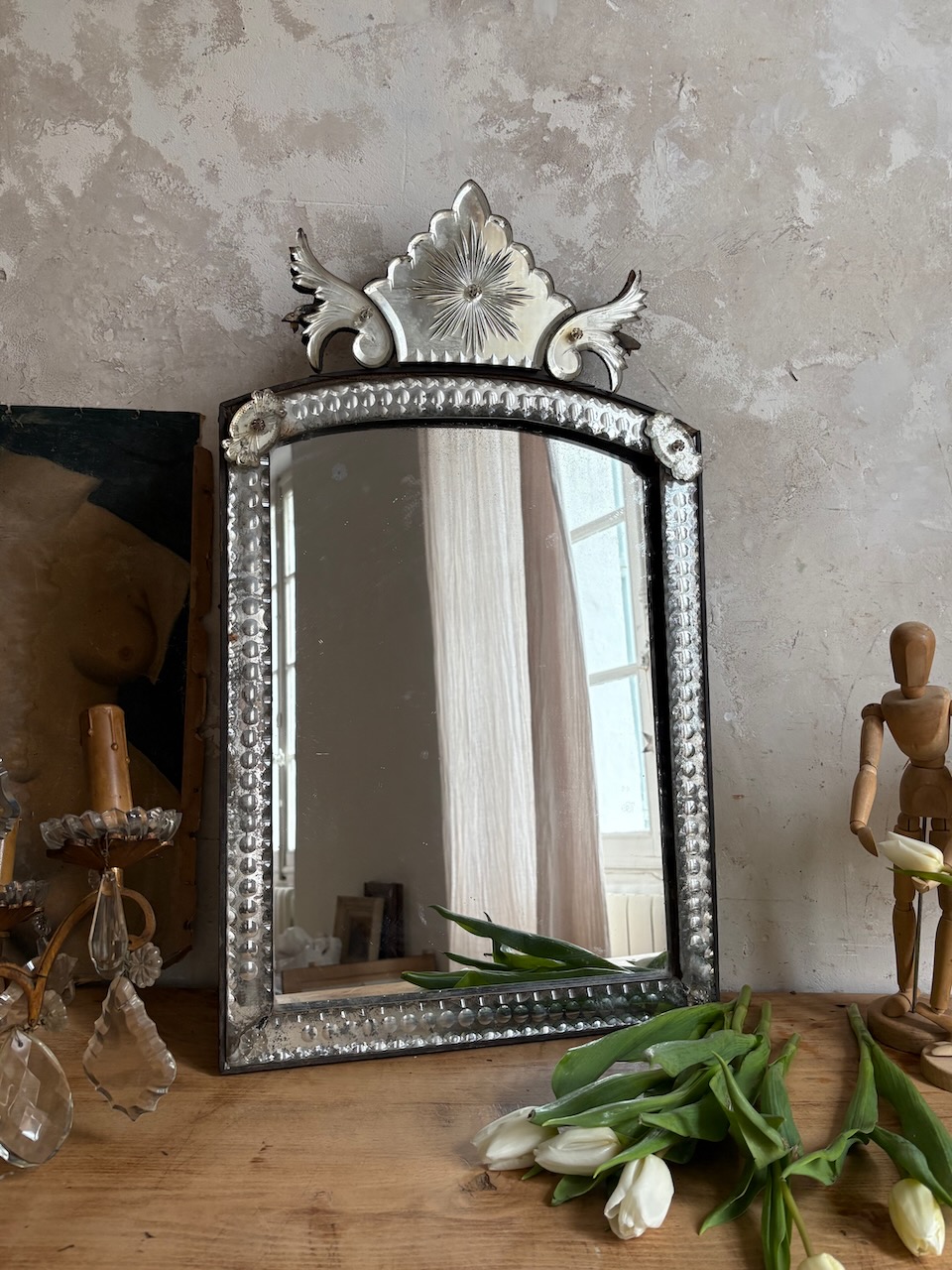Magnifique miroir ancien, à remarquer pour le travail exceptionnel du verre : chaque pièce est entièrement biseautée, offrant de superbes jeux de lumière et une grande finesse d’exécution.
